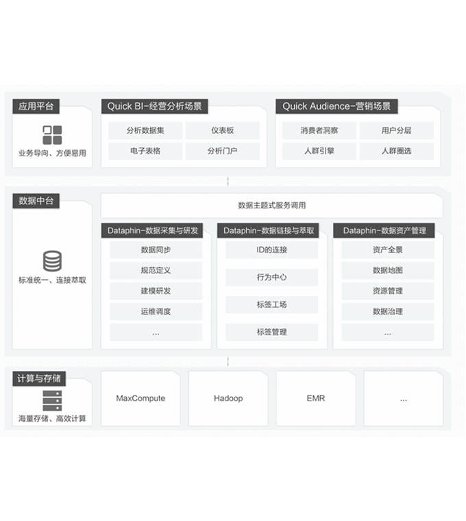 全域数据中台解决方案为客户提供从数据接入到数据消费全链路的一站式服务,为客户提供智能数据构建与管理的大数据能力,助力客户进行全域数据分析。同时,该解决方案以消费者运营为核心,通过丰富的用户洞察模型和便捷的策略配置,助力企业实现用户增长。