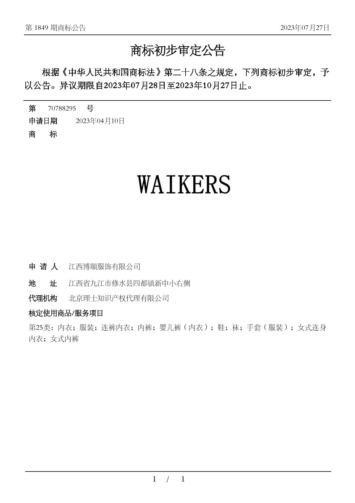 2501-内衣;2501-内裤;2501-女式内裤;2501-女式连身内衣;2501-服装;2501-连裤内衣;2502-婴儿裤(内衣);2502-服装;2503-服装;2504-服装;2505-服装;2507-鞋;2509-袜;2510-手套(服装) - 1849
