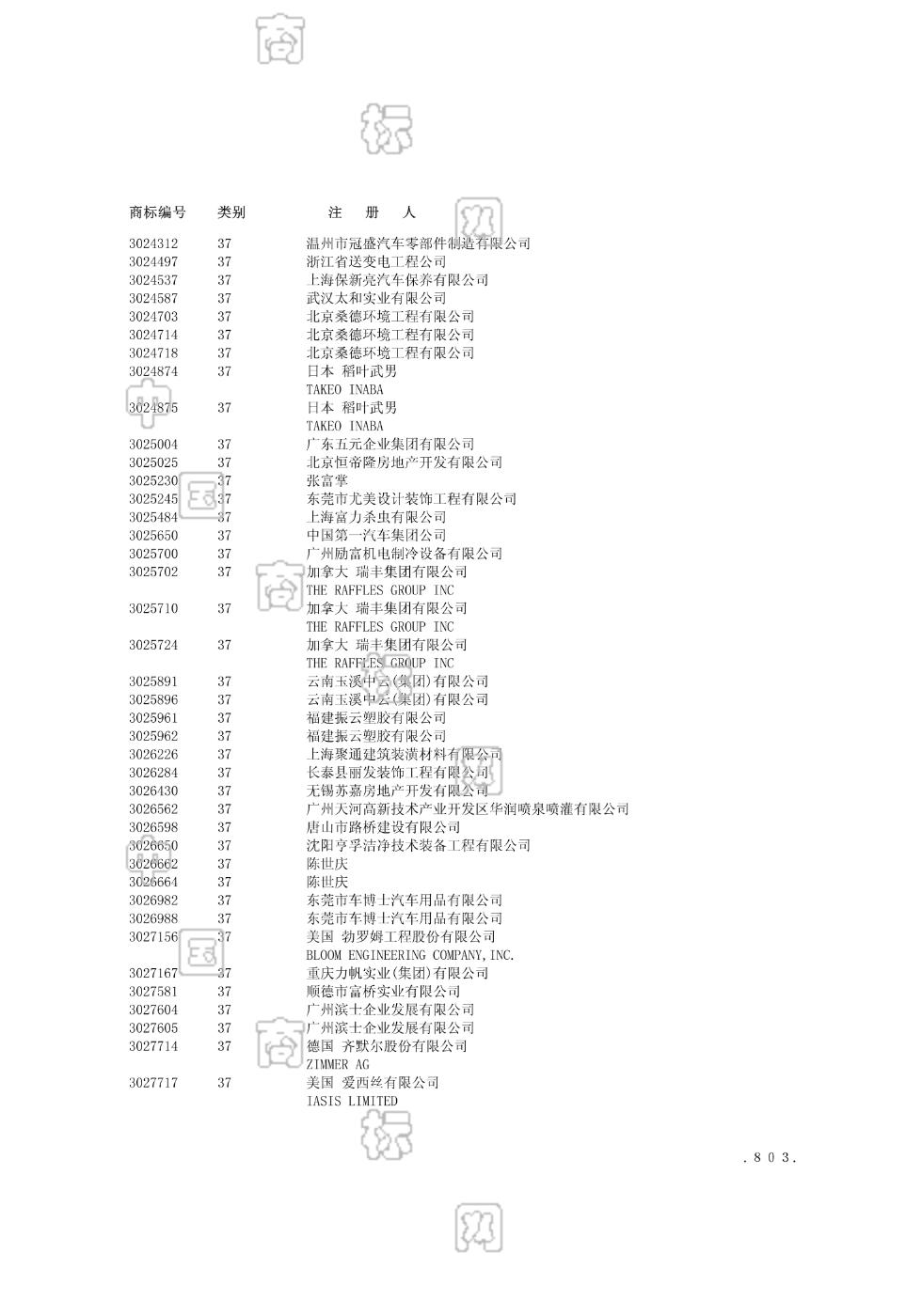 3701-建筑施工监督;3702-建筑;3702-道路铺设;3704-室内装璜;3705-供暖设备的安装和修理;3706-照明设备的安装和修理;3706-电器设备的安装与修理;3706-计算机硬件安装、维护和修理;3707-车辆服务站;3712-喷涂服务 - 867