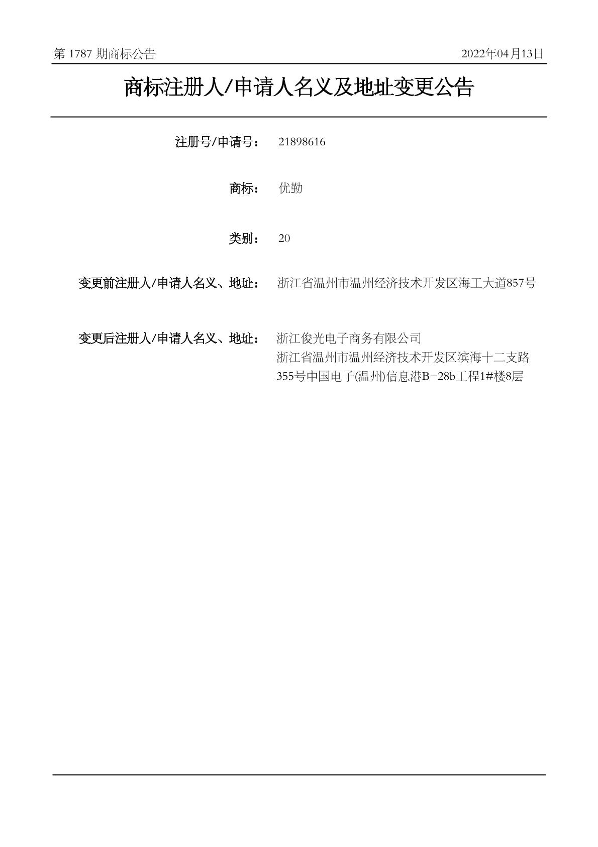 2022-03-31 变更商标申请人/注册人名义/地址 | 核准证明打印发送