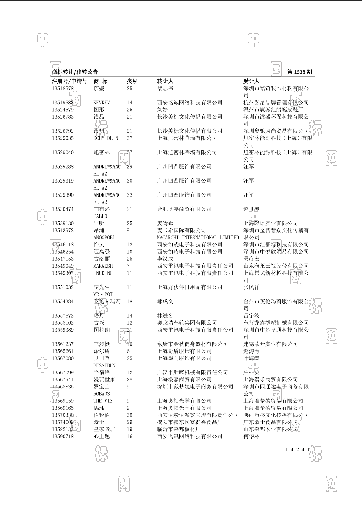 商标转让/移转公告 2024-06-27 第1893期 查看公告