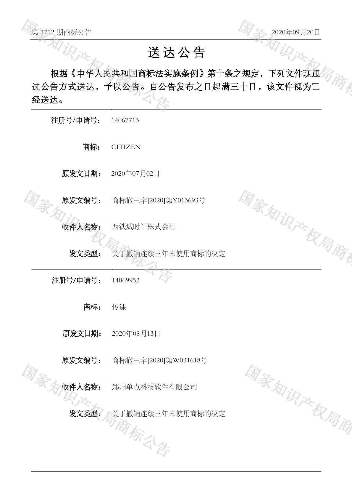 2020-09-21 撤销连续三年停止使用注册商标 | 排版送达公告(无退信)