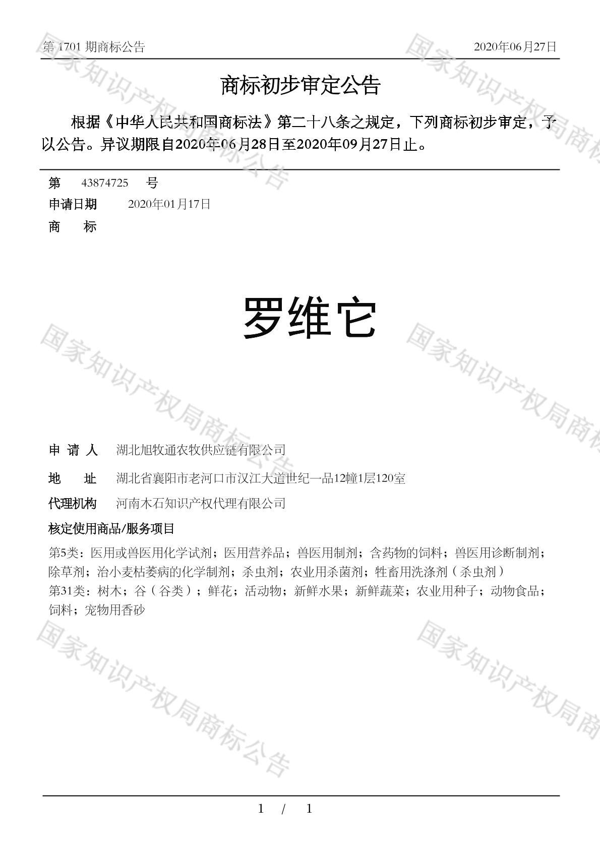 0501-医用或兽医用化学试剂;0502-医用营养品;0504-兽医用制剂;0504-兽医用诊断制剂;0504-含药物的饲料;0504-牲畜用洗涤剂(杀虫剂);0505-农业用杀菌剂;0505-杀虫剂;0505-治小麦枯萎病的化学制剂;0505-除草剂 - 1701
