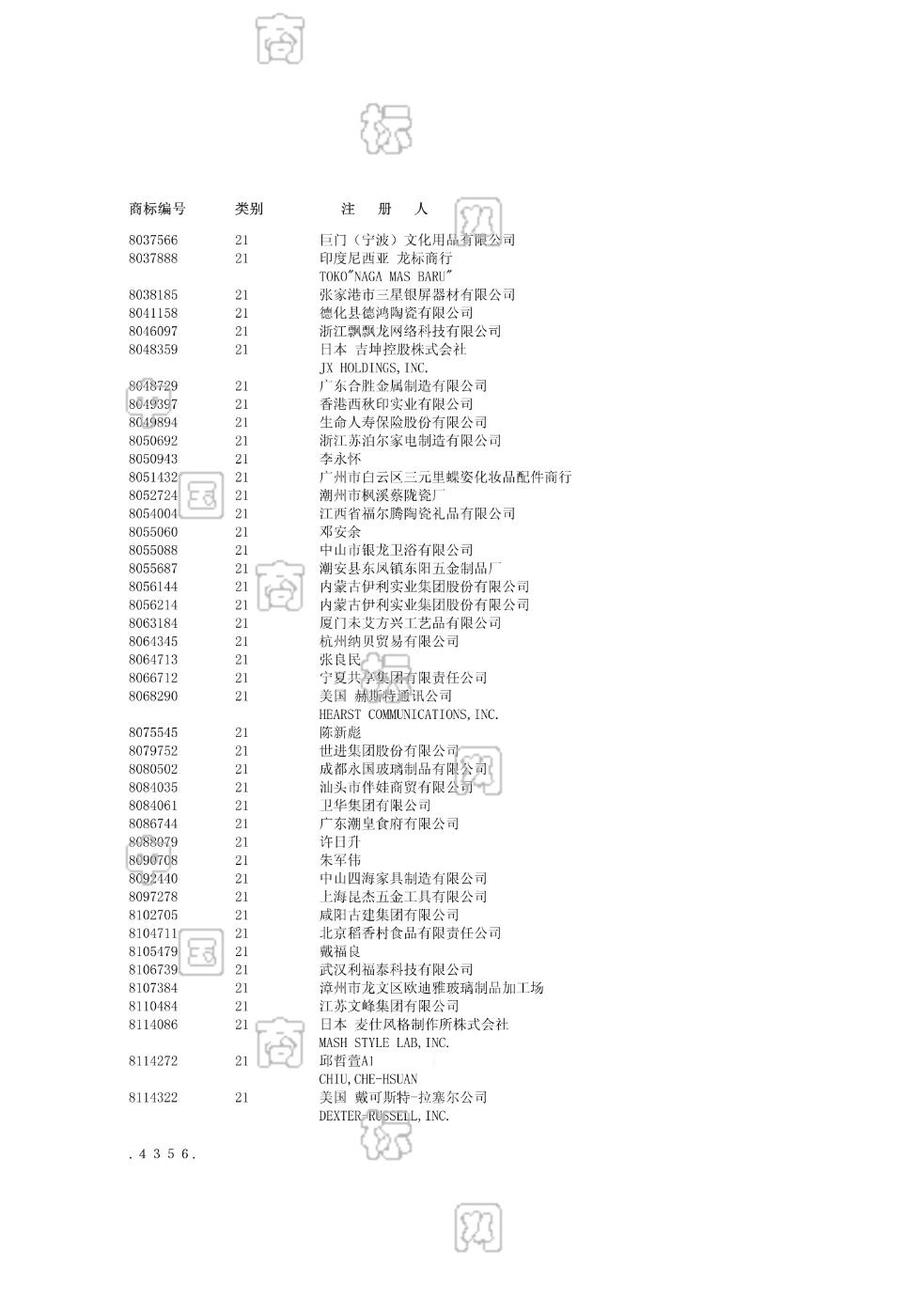2101-切菜板;2101-勺形铲(餐具);2101-家用或厨房用容器(装米容器);2101-家用非电动榨水果器;2101-开瓶刀;2101-手工操作的磨咖啡器以及磨胡椒器;2101-搅拌器;2101-摇动搅拌器;2101-擀面杖;2101-擦菜板(家庭用具);2101-漏勺;2101-漏斗;2101-烘蛋奶饼的非电铁模;2101-烤肉扦;2101-盐碟;2101-筷子;2101-筷子盒;2101-箩斗;2101-糖碗;2101-胡椒瓶;2101-蛋杯;2101-过滤器;2101-野营及户外用炊具;2101-野营及户外用餐具(刀、叉、匙除外);2101-锅;2101-锅垫;2101-非电气炊具;2101-餐具(刀、叉、匙除外);2101-餐巾架;2101-餐巾环;2101-馅饼用铲;2102-保存食品用玻璃瓶;2102-玻璃制或陶瓷制标志牌;2102-玻璃器皿(不包括玻璃塞、玻璃盖);2102-玻璃塞;2102-玻璃盖;2103-陶瓷器皿;2105-咖啡渗滤壶(电加热式除外);2106-卫生纸架;2106-喷壶;2106-室内培养池(种植物用);2106-搓衣板;2106-散发纸巾的金属盒;2106-洒水器;2106-浴室用提桶;2106-烛台;2106-热水搅拌棒;2106-煤桶;2106-煤渣用筛(家用器皿);2106-熄烛器;2106-熨衣板;2106-熨衣板.;2106-盆;2106-简易便壶;2106-肥皂分配器;2106-脱鞋器;2106-花和植物用盆(花展用);2106-花瓶;2106-花盆;2106-衣夹;2106-铁瓶;2106-非金属存钱罐;2106-鞋拔;2106-鞋楦头;2106-饮水瓶;2106-香炉;2107-制刷用猪毛;2107-宠物用刷;2107-工业用刷;2107-水槽用刷;2107-管道刷;2107-篦子;2107-船舶用刷;2107-衣服刷;2107-金属刷;2107-鞋刷;2108-电动牙刷;2109-牙签;2109-牙签盒;2109-牙线;2111-便携式冷却器;2111-保温瓶;2111-冰桶;2111-非电热壶;2112-家务手套;2112-擦鞋器(便携式);2112-擦鞋布;2112-清扫器;2112-清洁器具(手工操作);2113-未加工或半加工玻璃(建筑玻璃除外);2114-宠物用餐具;2114-室内水族池;2114-家畜槽;2114-家禽环;2114-鸟槽;2114-鸟笼;2115-捕鼠器;2115-蝇拍 - 1255