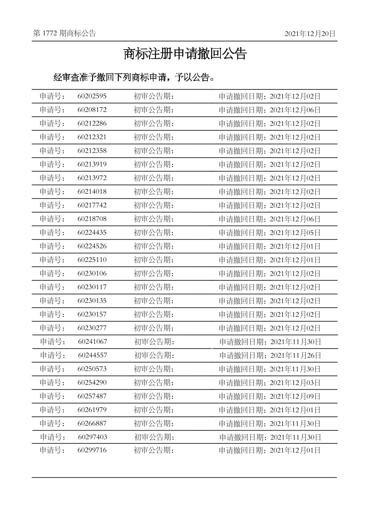 商标注册申请撤回公告 2021-12-20 第1772期 查看公告