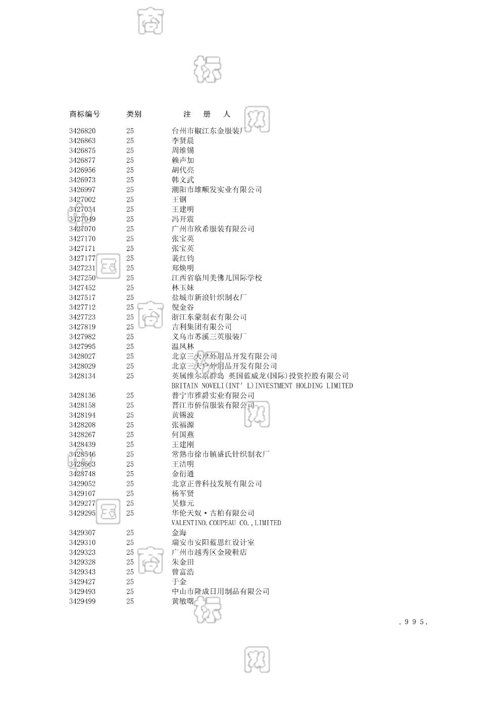2501-服装;2502-婴儿全套衣;2503-游泳衣;2504-防水服;2506-体操鞋;2507-鞋;2508-帽;2509-袜;2511-领带;2512-腰带 - 951