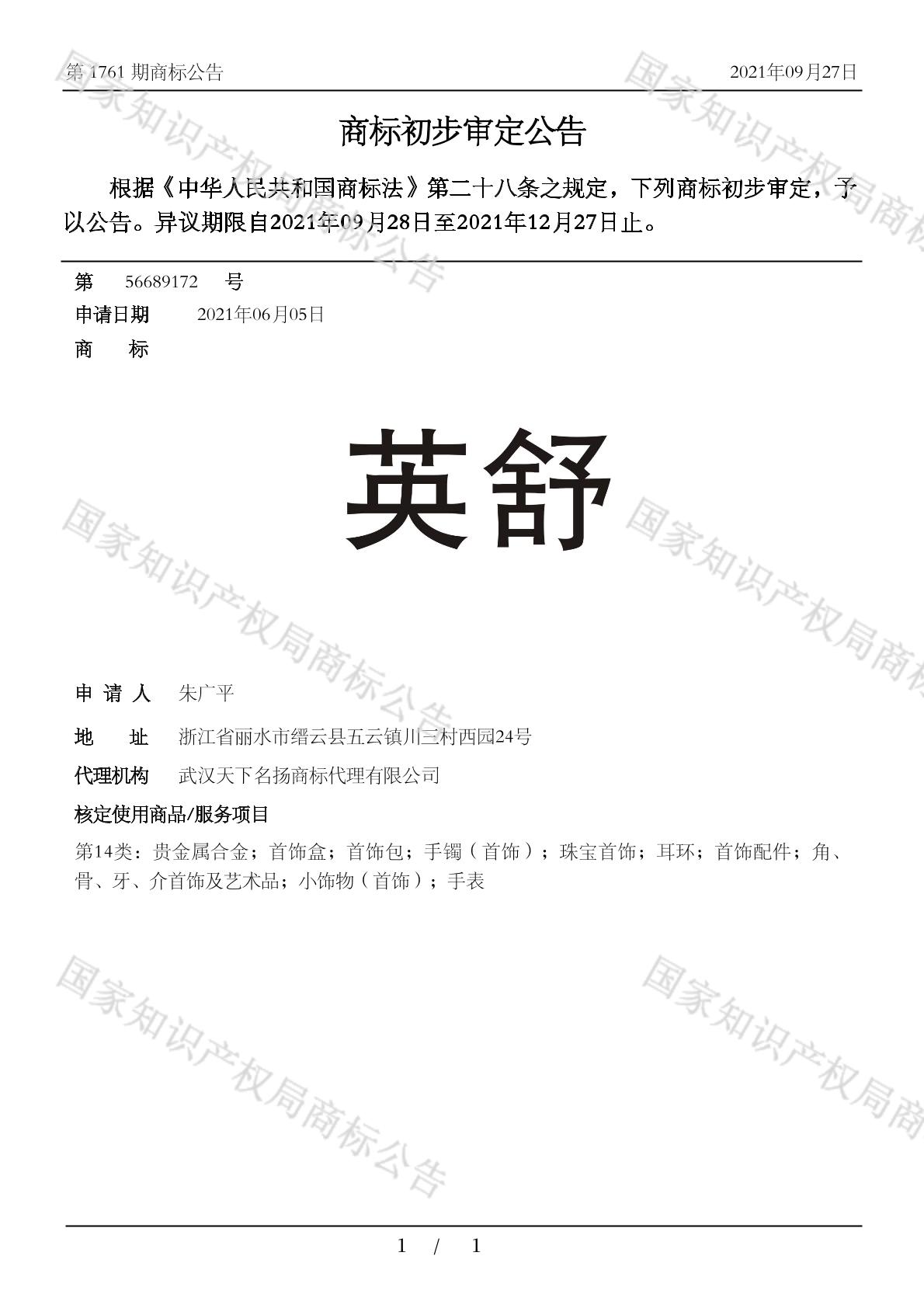 1401-贵金属合金;1402-首饰包;1402-首饰盒;1403-小饰物(首饰);1403-手镯(首饰);1403-珠宝首饰;1403-耳环;1403-角、骨、牙、介首饰及艺术品;1403-首饰配件;1404-手表 - 1761