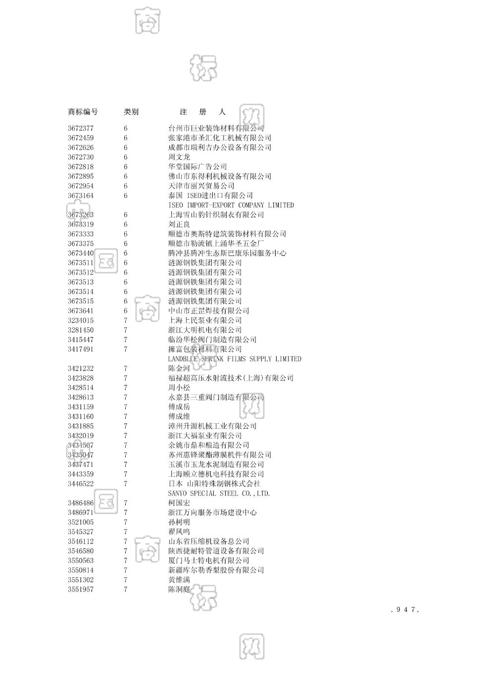 0701-农业机械;0719-汽车油泵;0748-机油滤清器;0748-柴油滤清器;0748-汽车发动冷却用风扇;0748-汽车发动机用机油泵;0748-空气滤清器;0748-马达和引擎起动器;0750-联轴器 - 954