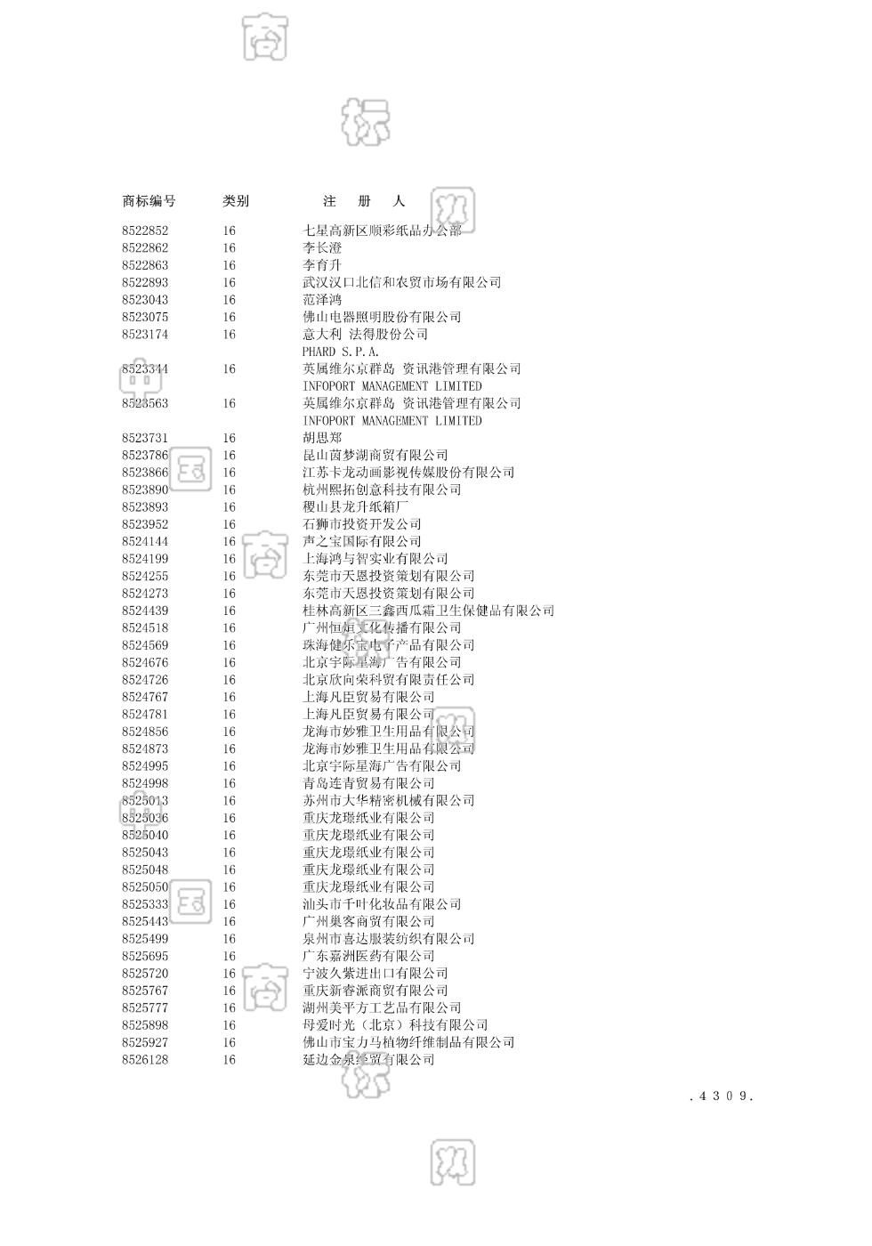 1601-纸;1602-复印纸(文具);1603-卫生纸;1603-纸垫;1603-纸餐巾;1605-印刷品;1606-书籍;1606-带有电子发声装置的儿童图书;1606-杂志(期刊);1607-图画;1609-包装纸;1611-文具;1614-书写工具;1615-文具及家用胶带;1619-教学材料(仪器除外) - 1262
