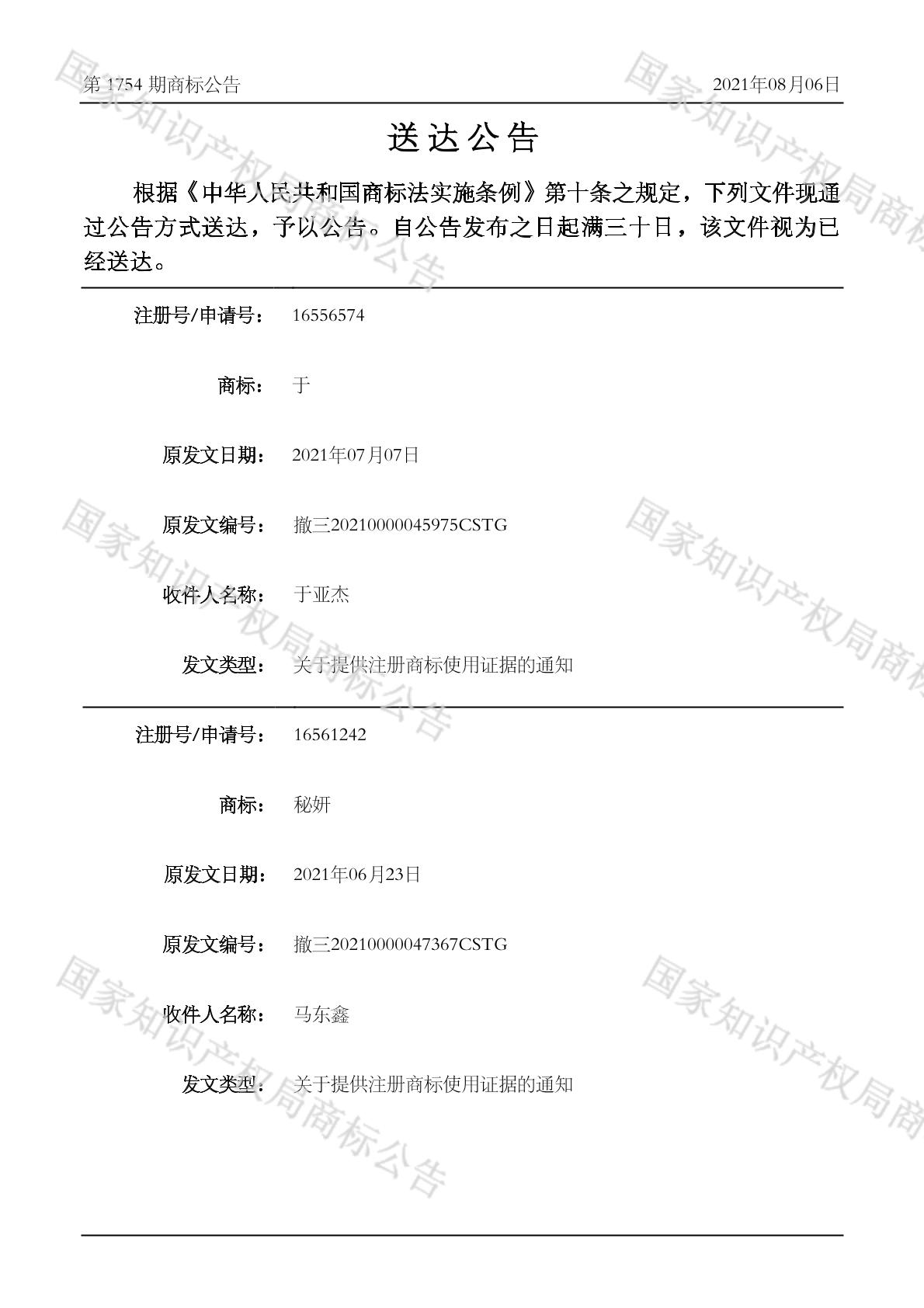 2021-08-06 撤销连续三年停止使用注册商标 | 排版送达公告(关于提供注册商标使用证据的通知)