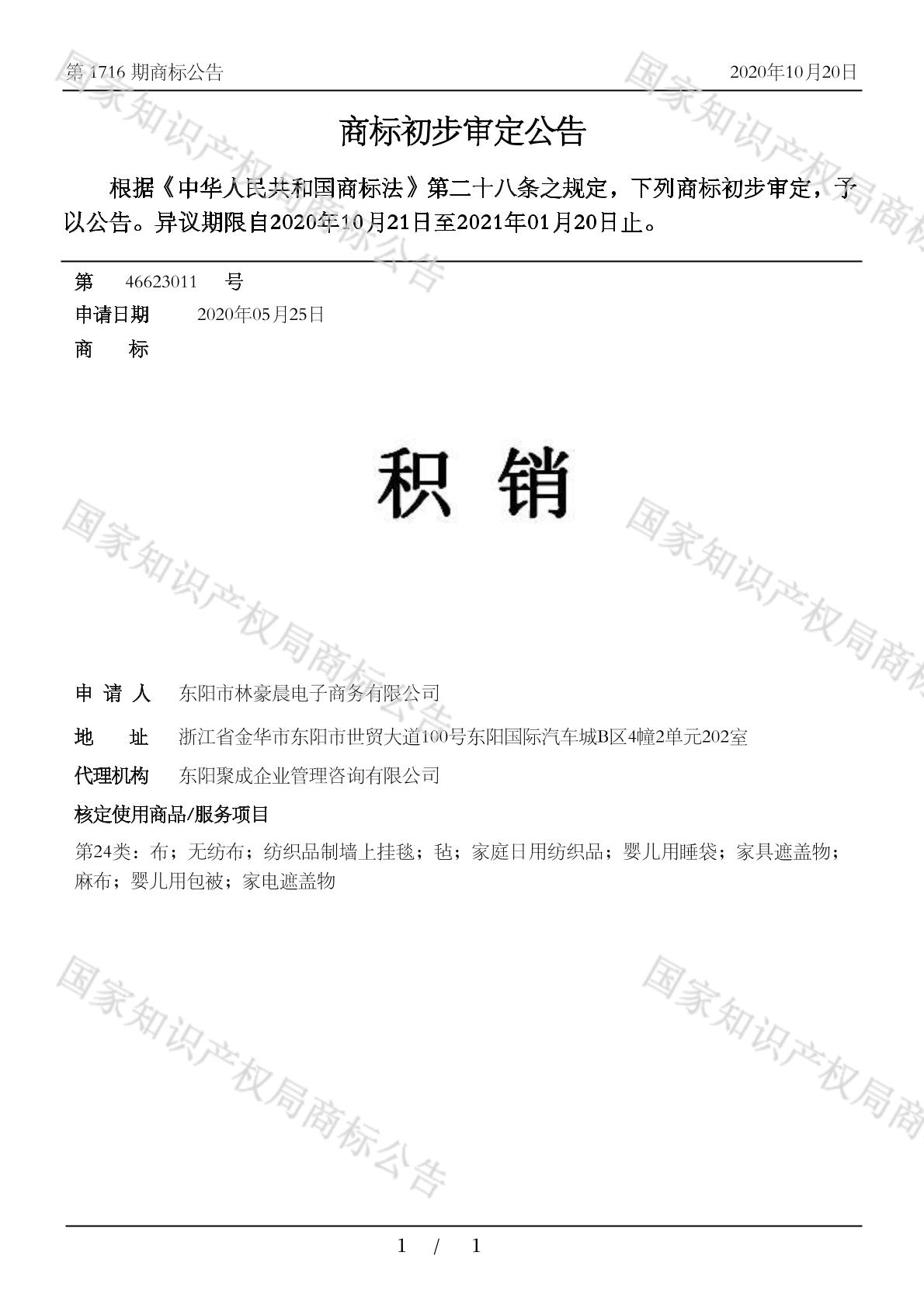 2401-布;2401-麻布;2402-无纺布;2403-纺织品制墙上挂毯;2404-毡;2405-家庭日用纺织品;2406-婴儿用包被;2406-婴儿用睡袋;2406-家庭日用纺织品;2407-家具遮盖物;2407-家庭日用纺织品;2407-家电遮盖物 - 1716