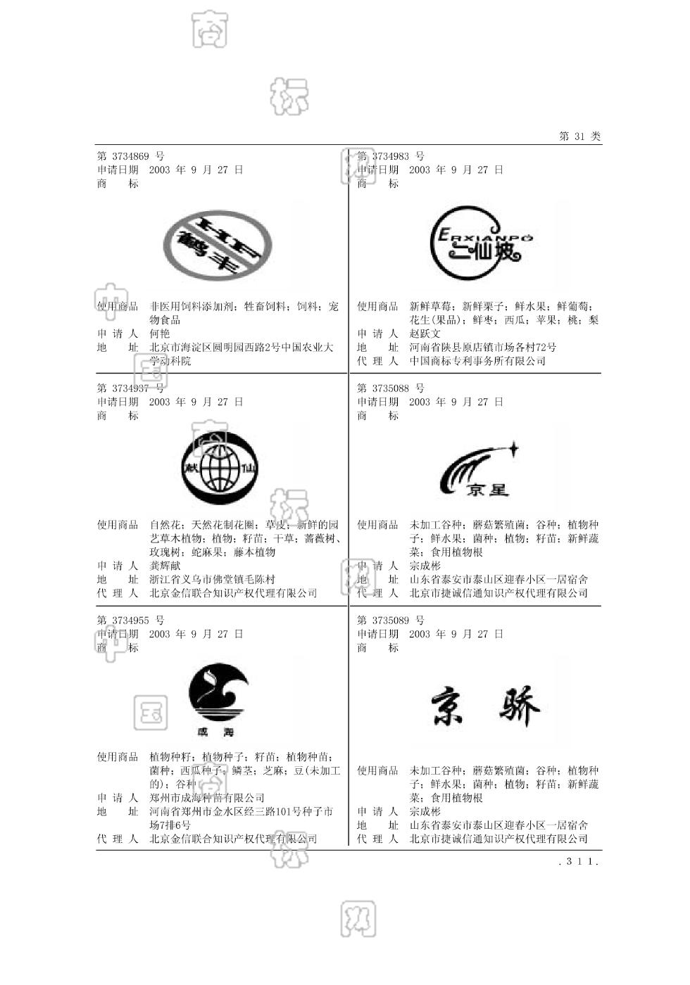3103-植物;3103-籽苗;3105-鲜水果;3106-新鲜蔬菜;3106-食用植物根;3107-未加工谷种;3107-植物种子;3107-菌种;3107-蘑菇繁殖菌;3107-谷种 - 962