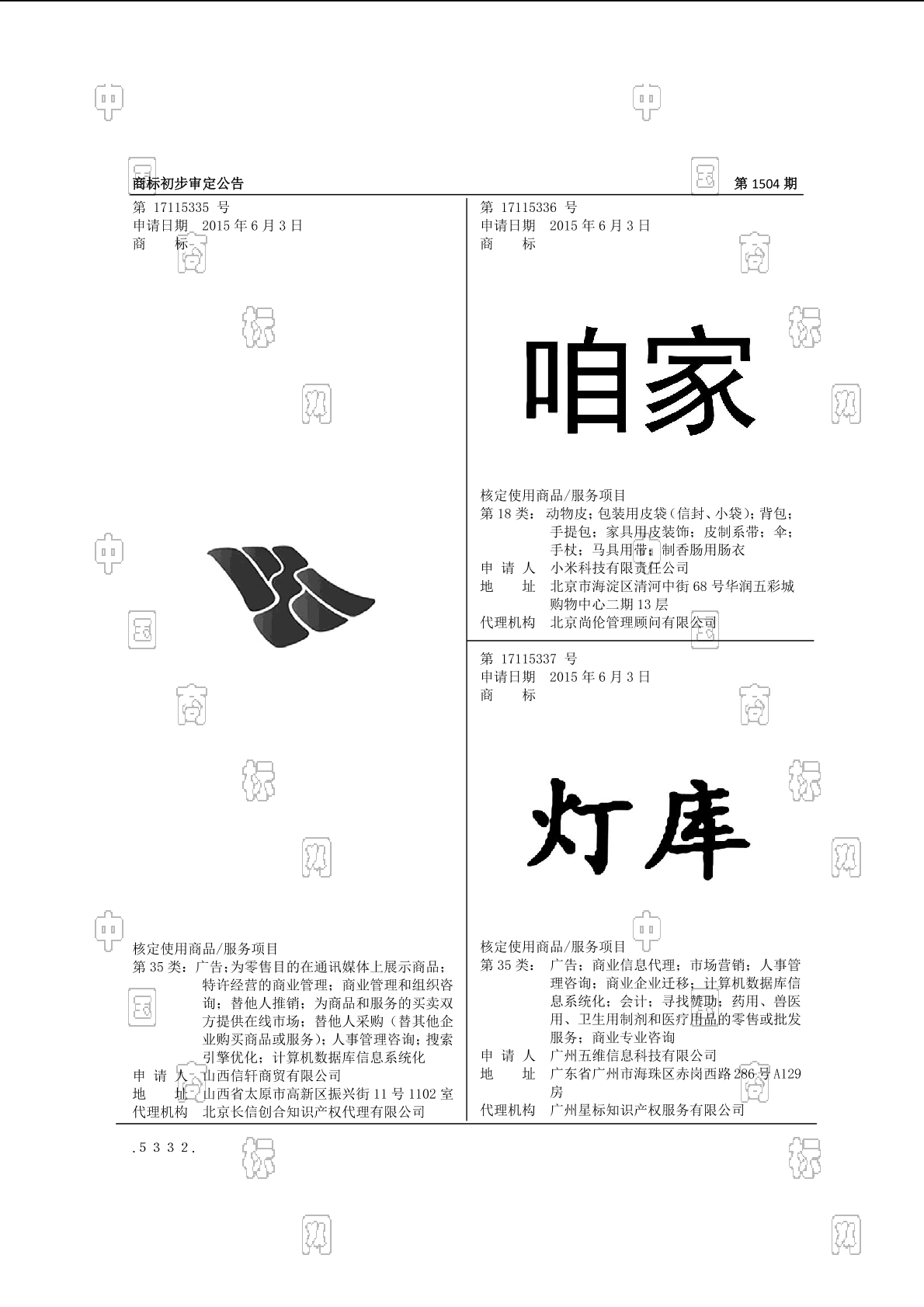 1801-动物皮;1802-包装用皮袋(信封、小袋);1802-家具用皮装饰;1802-手提包;1802-皮制系带;1802-背包;1804-伞;1805-手杖;1806-马具用带;1807-制香肠用肠衣 - 1504