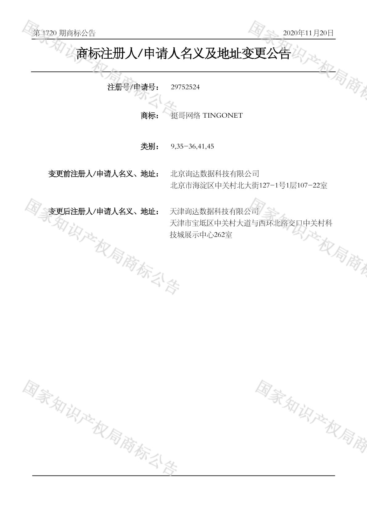 2020-11-06 变更商标申请人/注册人名义/地址 | 核准证明打印发送