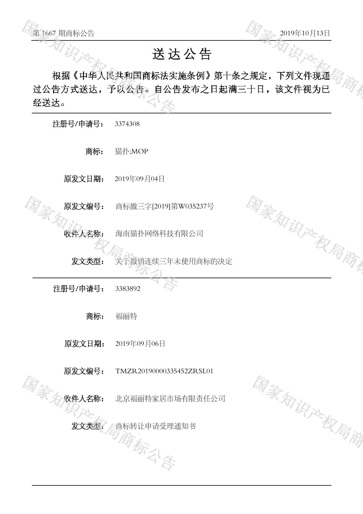 2019-10-16 商标转让 | 排版送达公告(商标转让申请受理通知书)