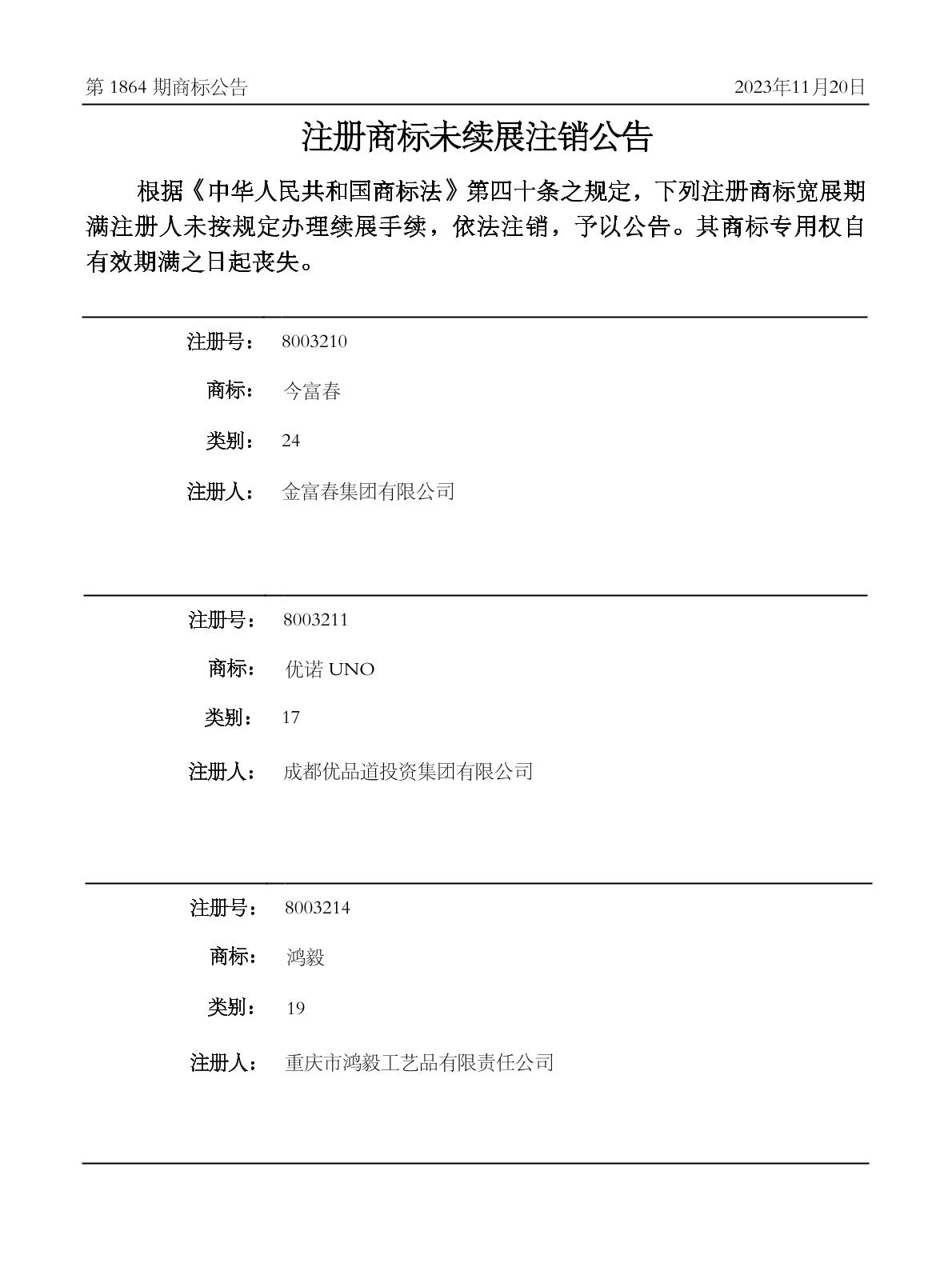 注册商标未续展注销公告 2023-11-20 第1864期 查看公告