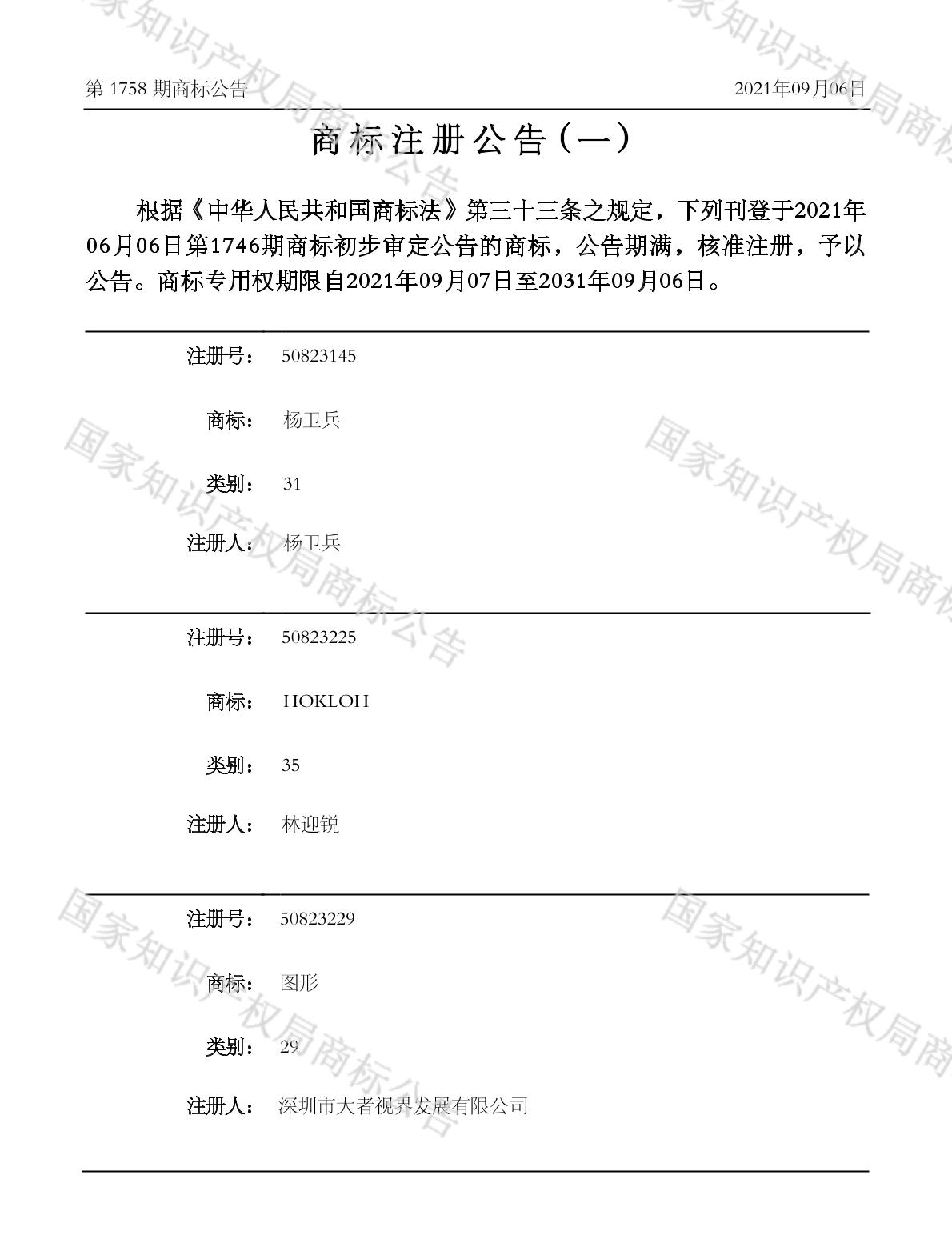 【杨卫兵】商标详情