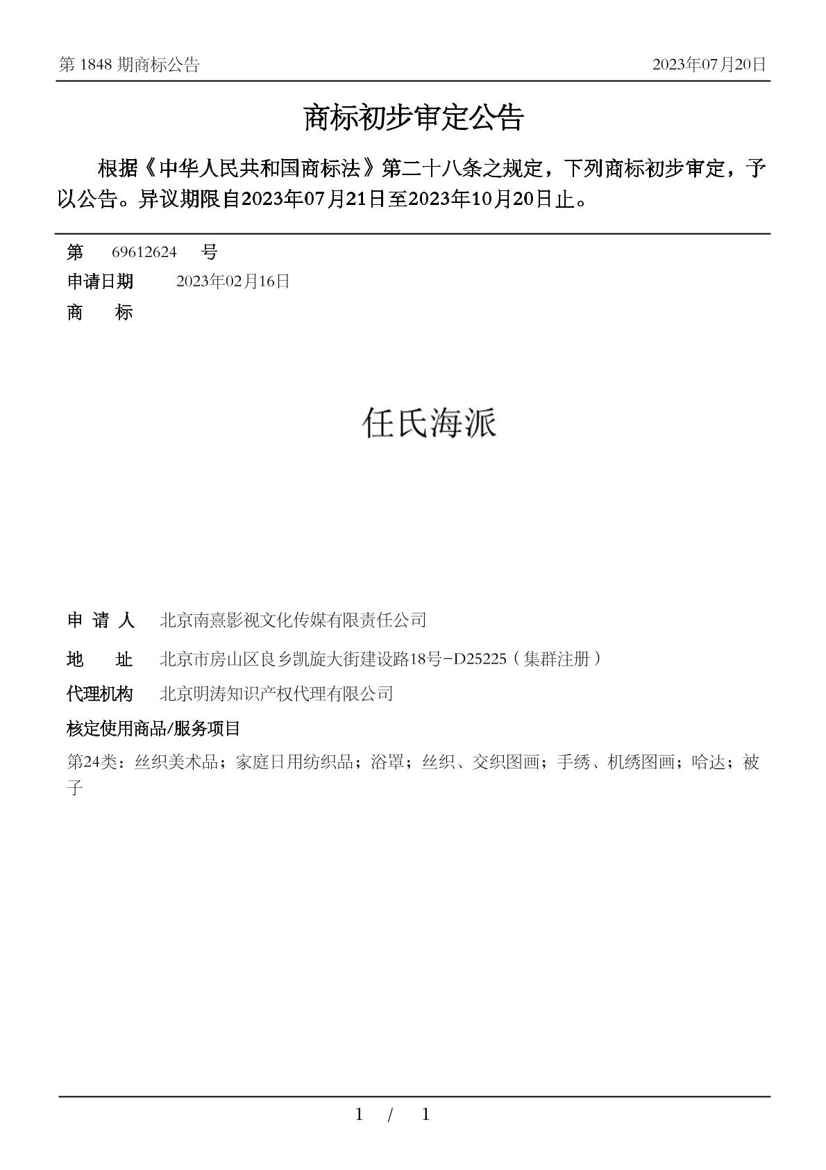 2401-精纺丝织品;2401-装饰织品;2403-丝织、交织图画;2403-丝织美术品;2403-手绣、机绣图画;2405-家庭日用纺织品;2406-家庭日用纺织品;2406-床单和枕套;2406-被子;2407-家庭日用纺织品;2407-浴罩;2409-哈达 - 1848