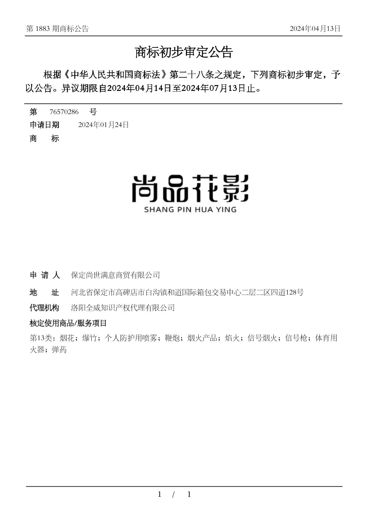 1301-体育用火器;1301-信号枪;1301-弹药;1303-信号烟火;1303-烟火产品;1303-烟花;1303-焰火;1303-爆竹;1303-鞭炮;1304-个人防护用喷雾 - 1883