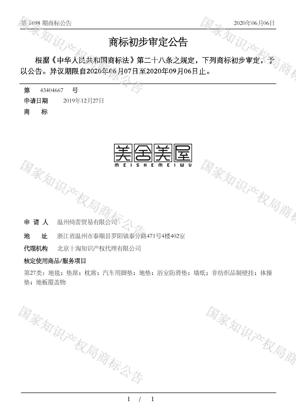2701-地毯;2702-垫席;2702-枕席;2703-体操垫;2703-地垫;2703-地板覆盖物;2703-汽车用脚垫;2703-浴室防滑垫;2704-墙纸;2704-非纺织品制壁挂 - 1698