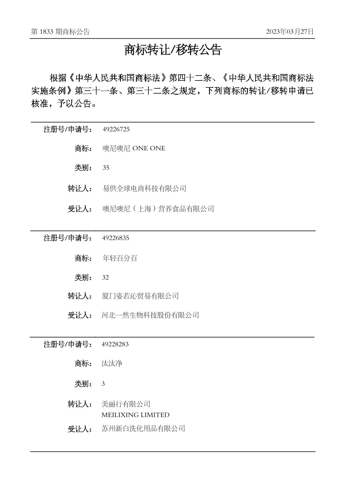 2023-03-31 商标转让 | 核准证明打印发送