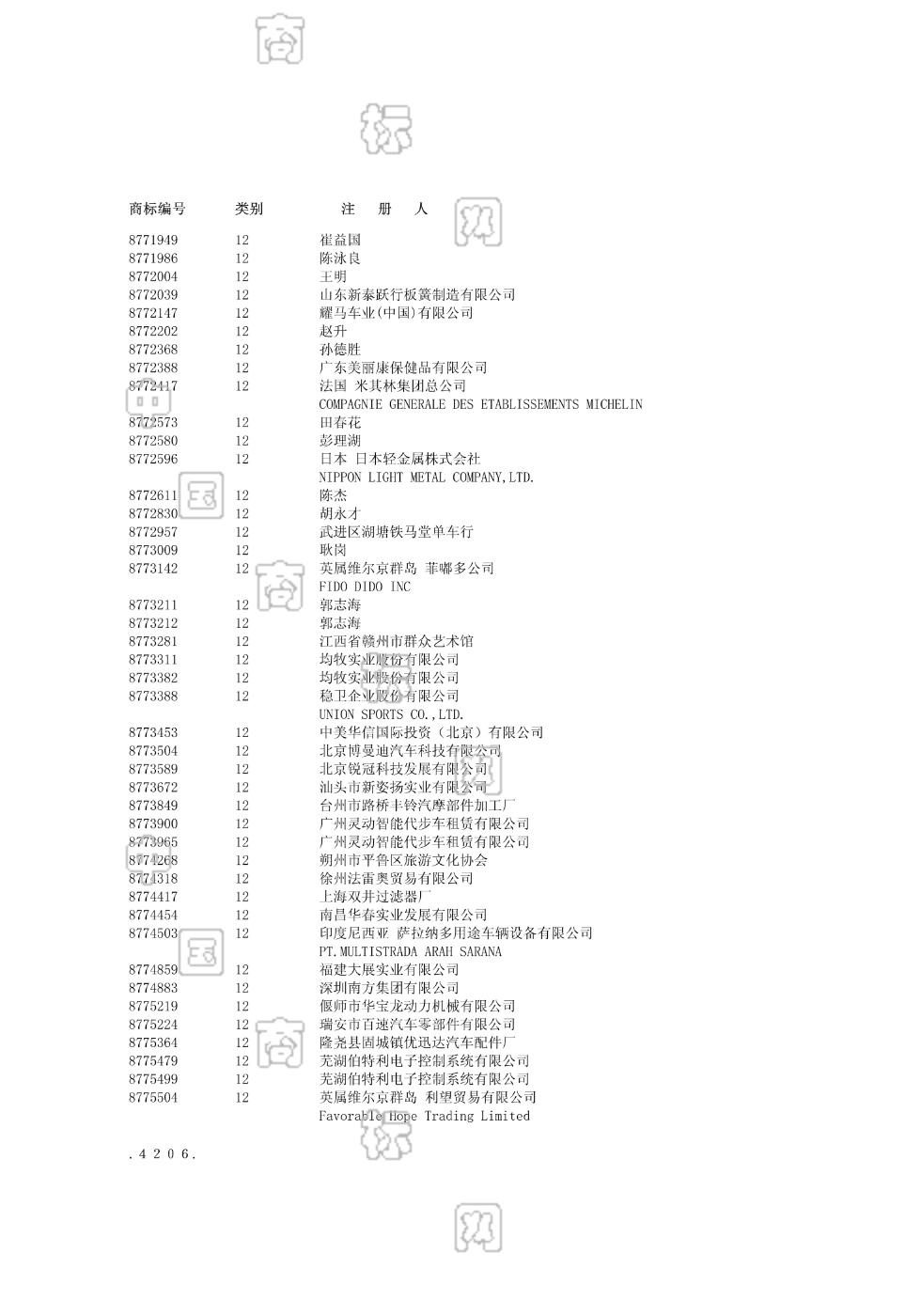 1201-陆、空、水或铁路用机动运载器;1202-小汽车;1202-汽车;1202-电动车辆;1202-车辆内装饰品;1202-陆、空、水或铁路用机动运载器;1202-陆地车辆电力发动机;1203-摩托车;1203-陆、空、水或铁路用机动运载器;1204-自行车;1204-陆、空、水或铁路用机动运载器;1208-车辆轮胎;1209-陆、空、水或铁路用机动运载器;1209-飞机;1210-陆、空、水或铁路用机动运载器 - 1274