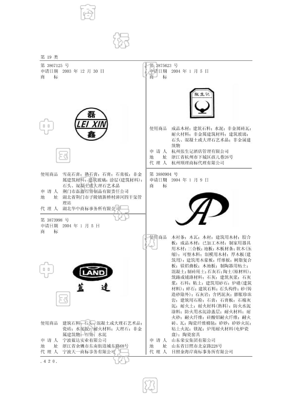 1903-熟石膏;1903-石膏;1903-石膏板;1903-雪花石膏;1904-水泥;1906-砖;1909-非金属建筑材料;1911-建筑玻璃;1912-涂层(建筑材料);1914-石头、混凝土或大理石艺术品 - 1024