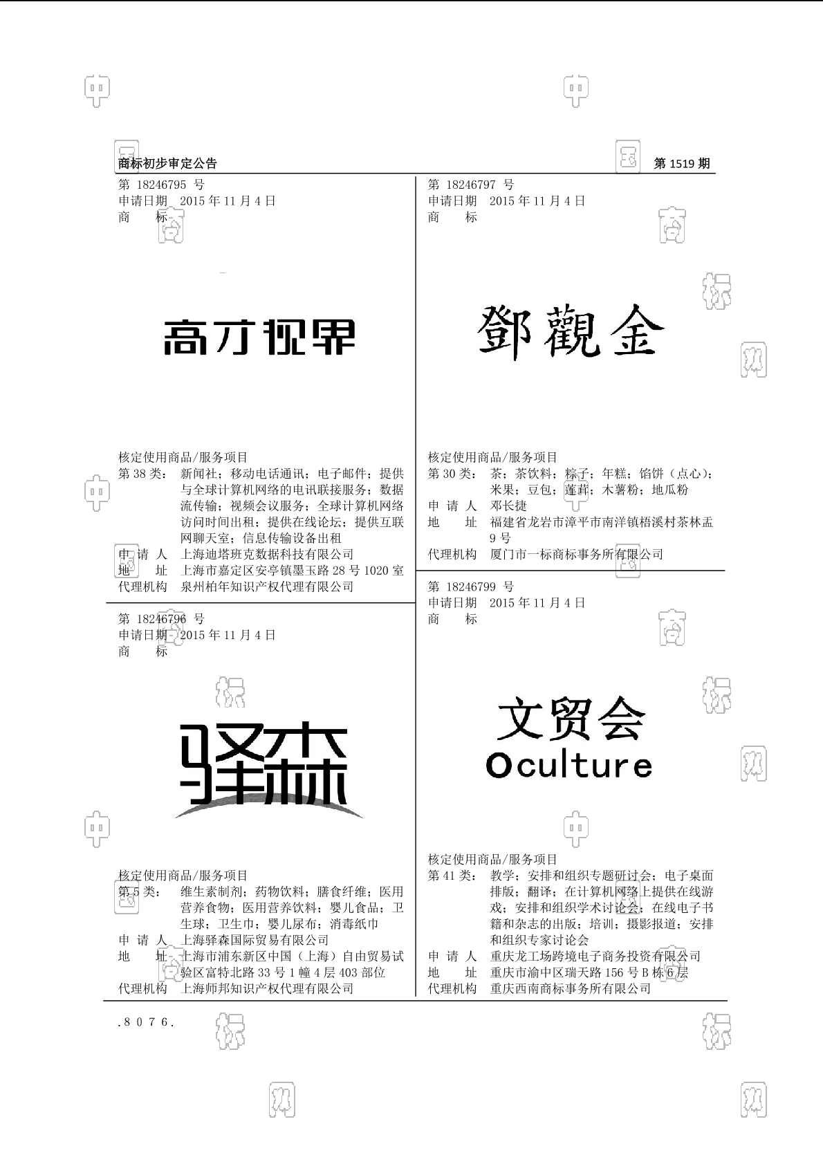3801-新闻社;3802-信息传输设备出租;3802-全球计算机网络访问时间出租;3802-提供与全球计算机网络的电讯联接服务;3802-提供互联网聊天室;3802-提供在线论坛;3802-数据流传输;3802-电子邮件;3802-移动电话通讯;3802-视频会议服务 - 1519