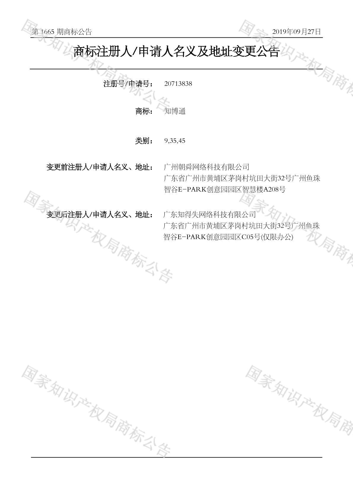 2019-09-11 变更商标申请人/注册人名义/地址 | 核准证明打印发送