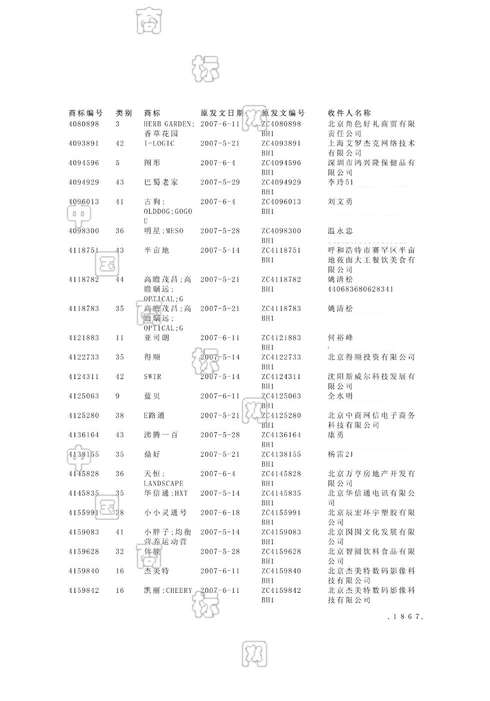 2007-05-28 商标注册申请 | 打印驳回通知