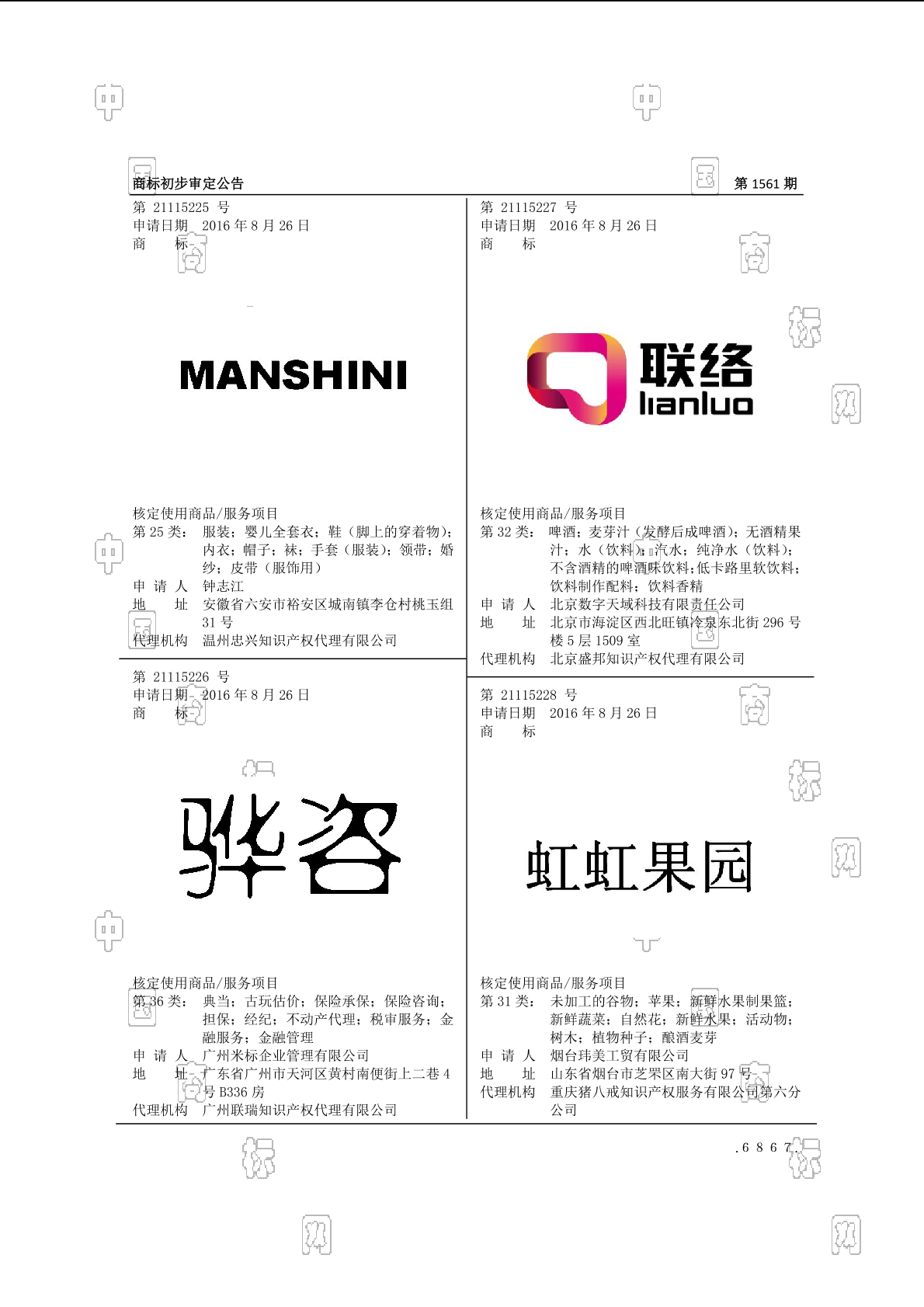 2016-11-04 商标注册申请 | 等待受理通知书发文