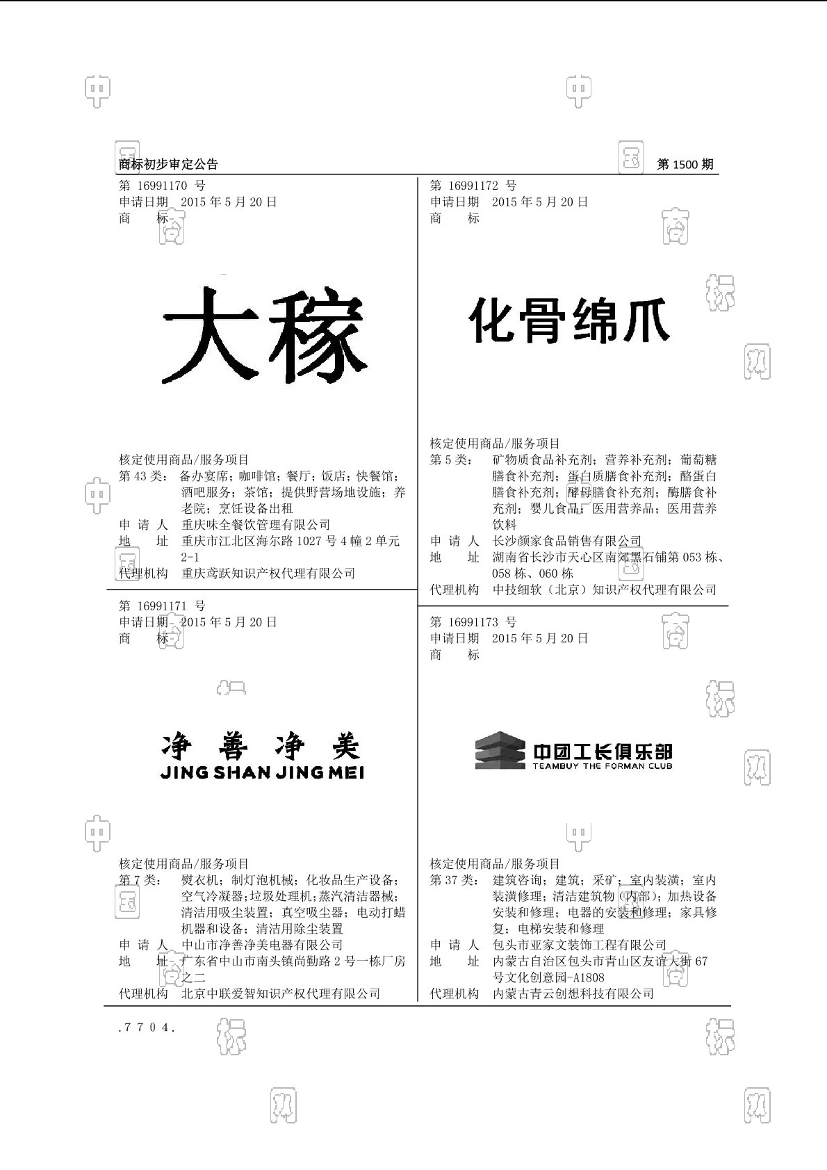 0713-熨衣机;0720-制灯泡机械;0729-化妆品生产设备;0749-空气冷凝器;0752-垃圾处理机;0752-清洁用吸尘装置;0752-清洁用除尘装置;0752-电动打蜡机器和设备;0752-真空吸尘器;0752-蒸汽清洁器械 - 1500