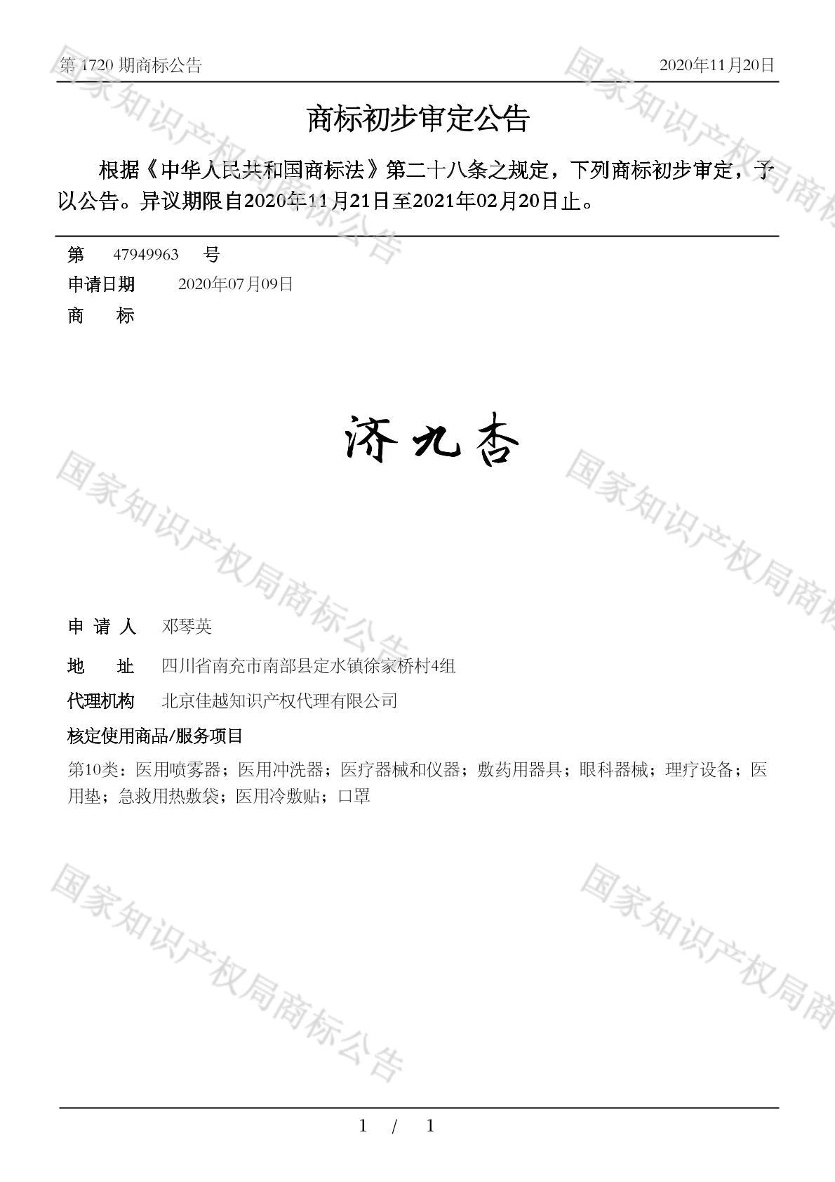1001-医用冲洗器;1001-医用喷雾器;1001-医疗器械和仪器;1001-敷药用器具;1001-眼科器械;1003-理疗设备;1004-医用冷敷贴;1004-医用垫;1004-口罩;1004-急救用热敷袋 - 1720