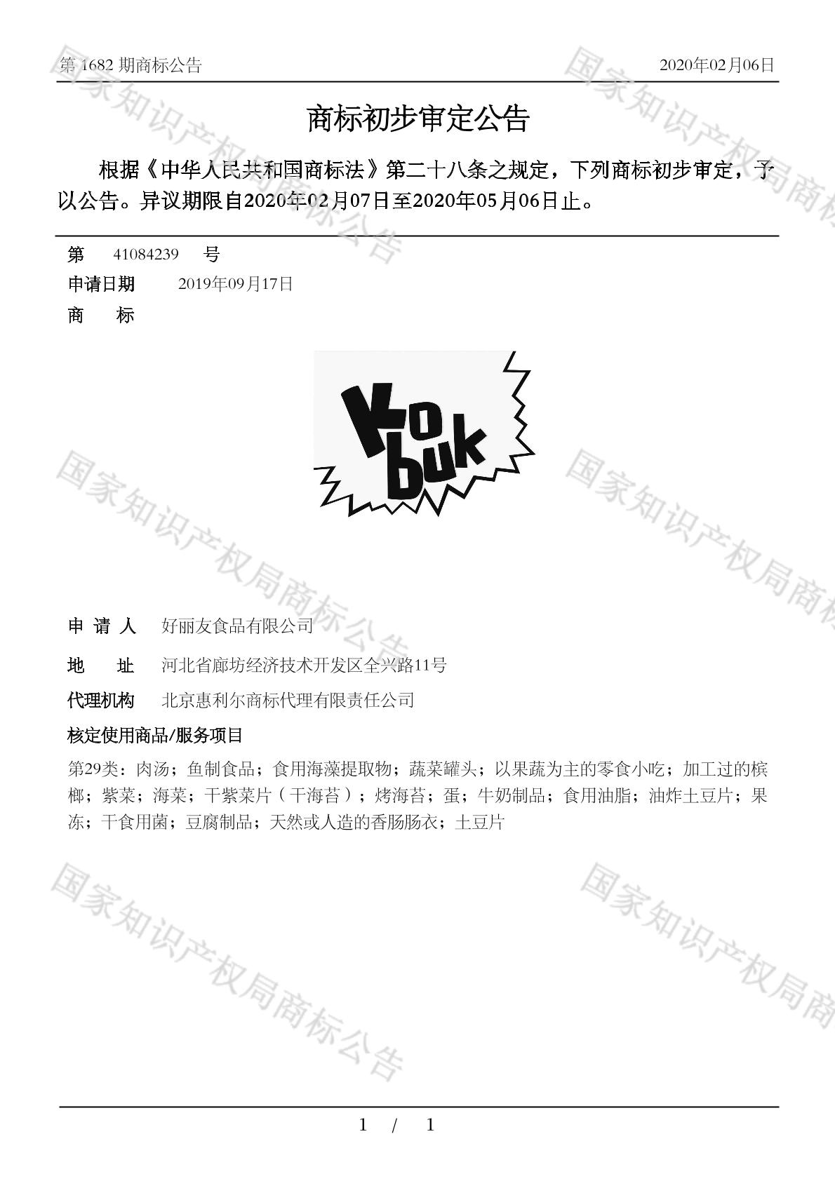2901-肉汤;2902-食用海藻提取物;2902-鱼制食品;2903-蔬菜罐头;2904-以果蔬为主的零食小吃;2904-加工过的槟榔;2904-土豆片;2904-油炸土豆片;2905-干紫菜片(干海苔);2905-海菜;2905-烤海苔;2905-紫菜;2906-蛋;2907-牛奶制品;2908-食用油脂;2910-果冻;2911-以果蔬为主的零食小吃;2912-干食用菌;2913-豆腐制品;2914-天然或人造的香肠肠衣 - 1682