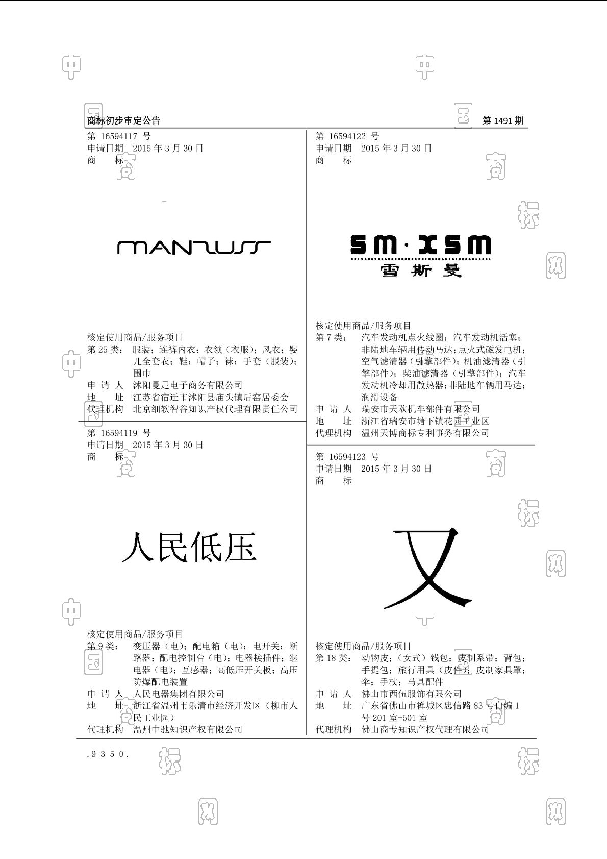 1801-动物皮;1802-手提包;1802-旅行用具(皮件);1802-皮制家具罩;1802-皮制系带;1802-背包;1802-(女式)钱包;1804-伞;1805-手杖;1806-马具配件 - 1491