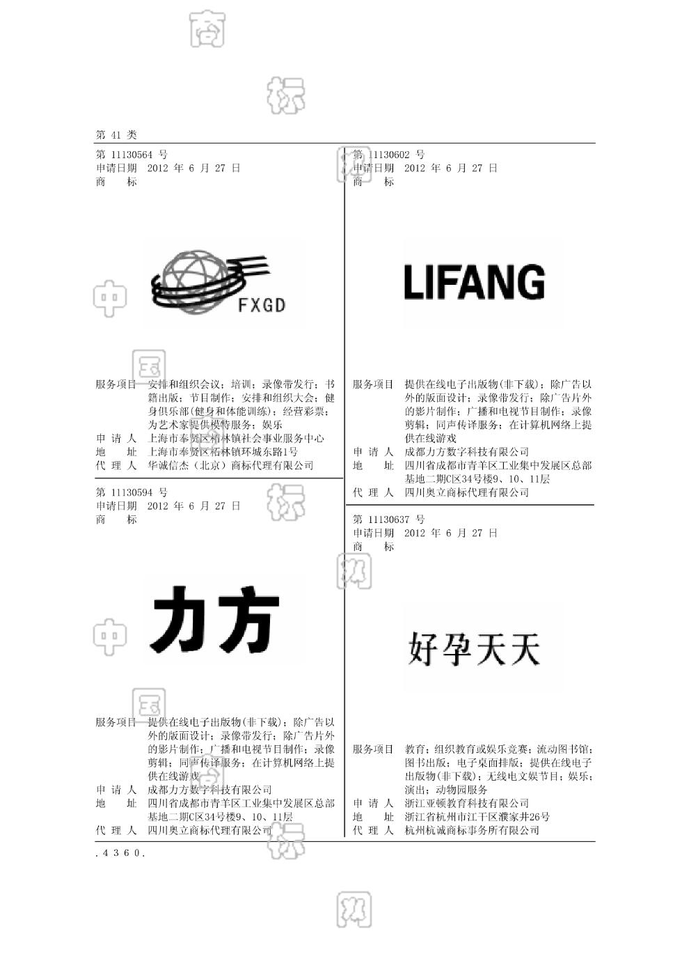 4104-录像带发行;4104-提供在线电子出版物(非下载);4104-除广告以外的版面设计;4105-同声传译服务;4105-在计算机网络上提供在线游戏;4105-广播和电视节目制作;4105-录像剪辑;4105-除广告片外的影片制作 - 1371