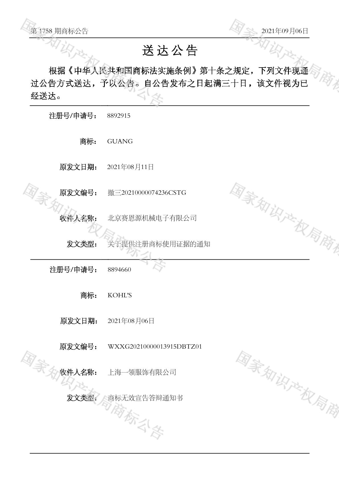 2021-09-06 撤销连续三年停止使用注册商标 | 排版送达公告(关于提供注册商标使用证据的通知)
