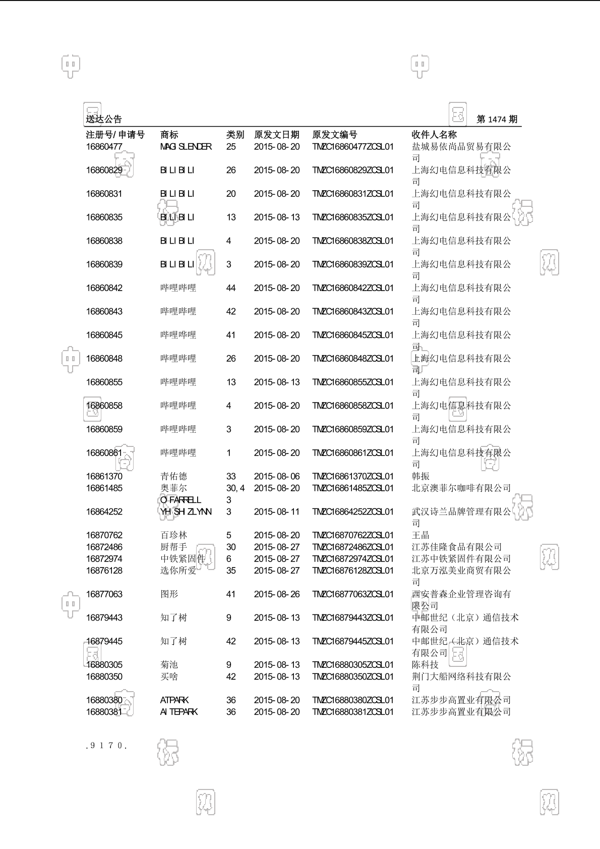 2015-10-08 商标注册申请 | 排版送达公告(商标注册申请受理通知书)