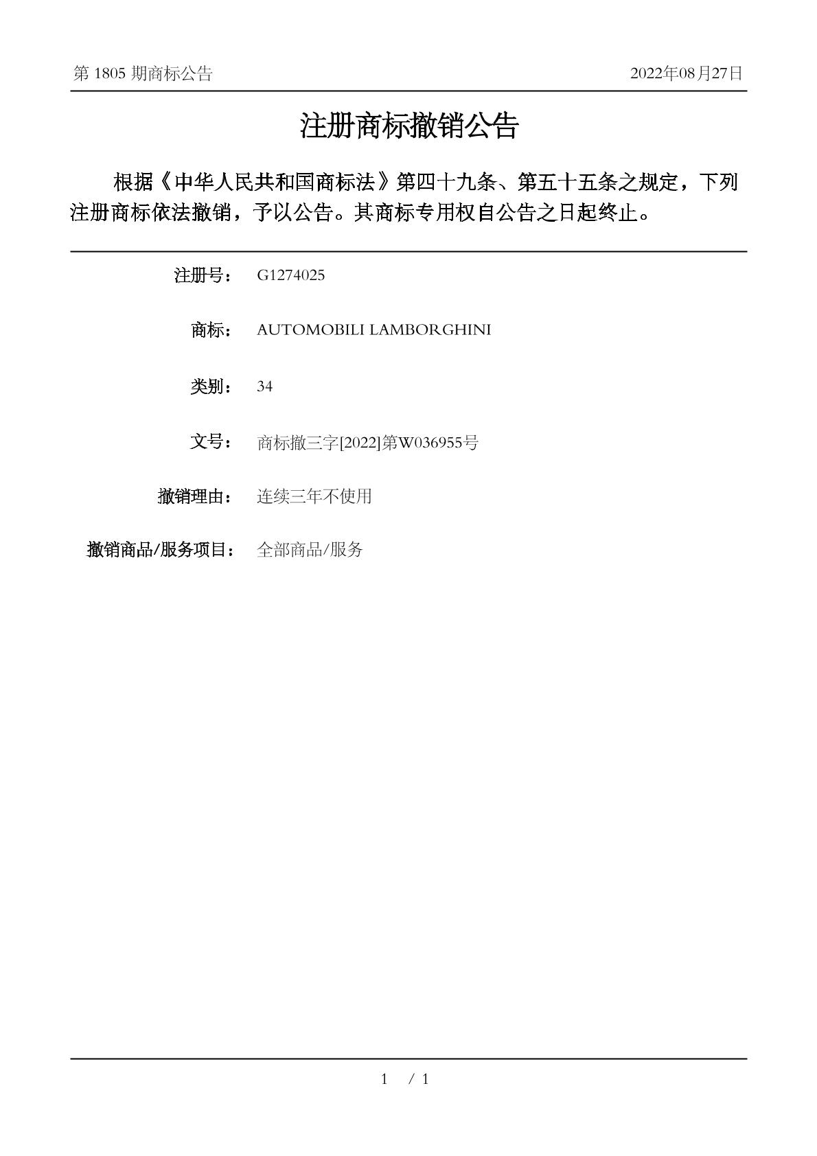 注册商标撤销公告 2022-08-27 第1805期 查看公告