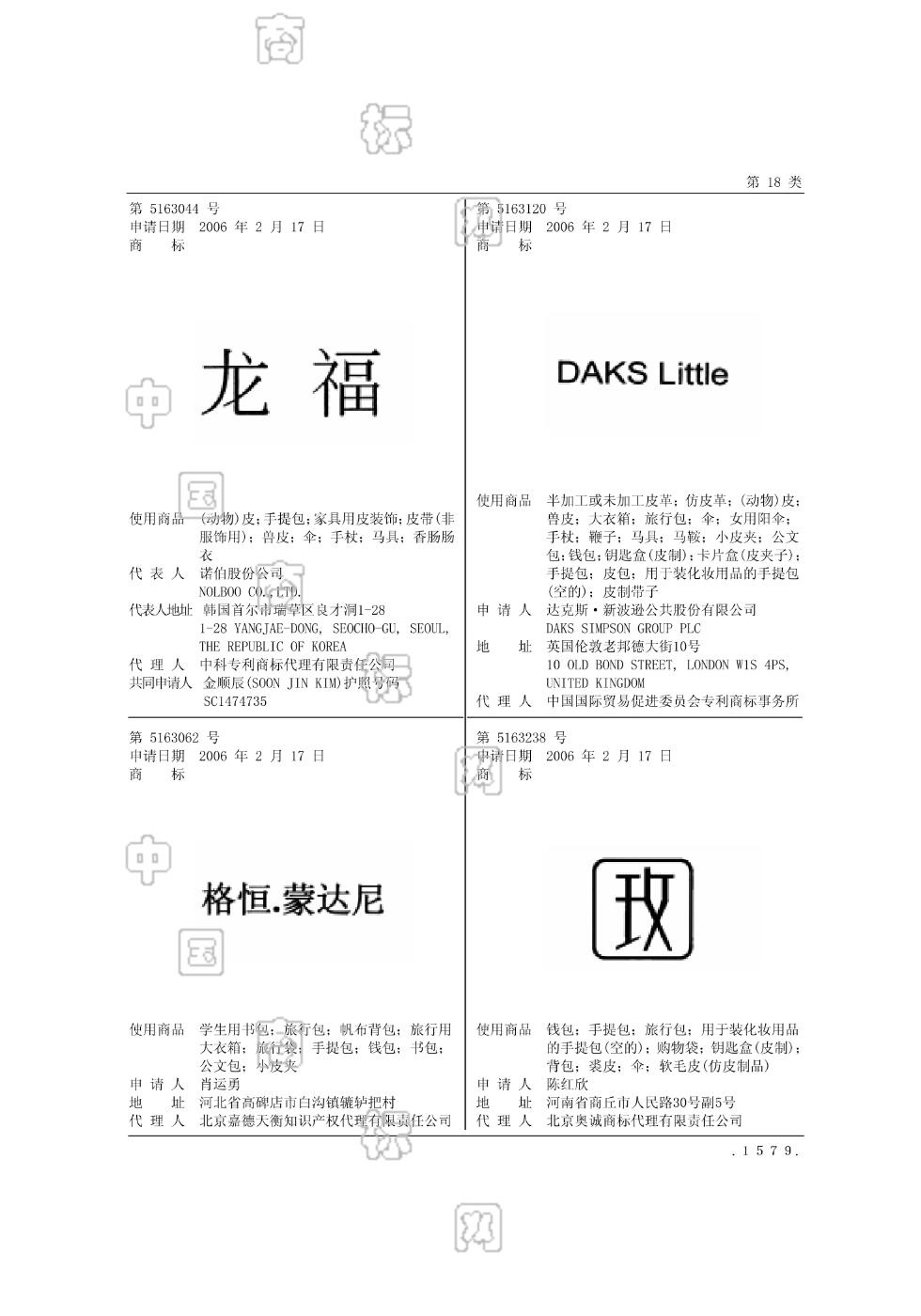 1801-(动物)皮;1801-仿皮革;1801-半加工或未加工皮革;1802-公文包;1802-卡片盒(皮夹子);1802-大衣箱;1802-小皮夹;1802-手提包;1802-旅行包;1802-用于装化妆用品的手提包(空的);1802-皮制带子;1802-皮包;1802-钥匙盒(皮制);1802-钱包;1803-兽皮;1804-伞;1804-女用阳伞;1805-手杖;1806-鞭子;1806-马具;1806-马鞍 - 1162