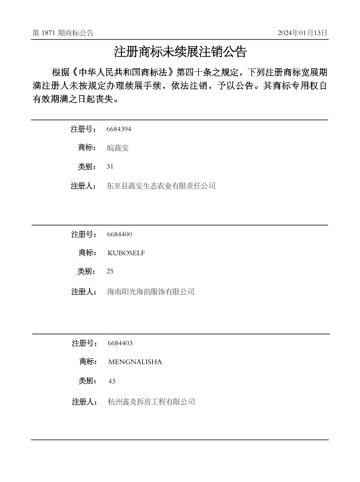2024-01-15 期满未续展注销商标 | 排版未续展注销公告