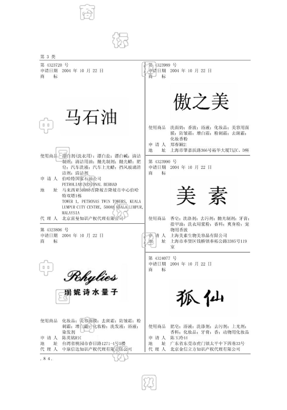 0301-洗涤剂;0301-浴液;0301-肥皂;0302-去污剂;0303-上光剂;0305-香料;0306-化妆品;0307-牙膏;0308-香;0309-动物用化妆品 - 1085