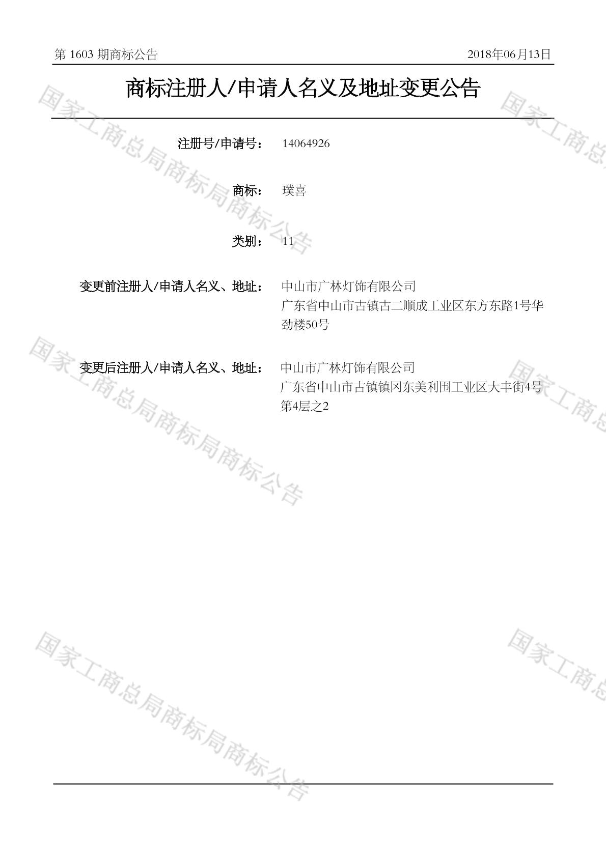 2018-06-19 变更商标申请人/注册人名义/地址 | 核准证明打印发送