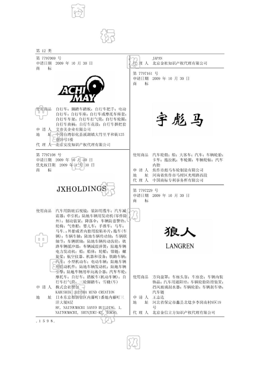 1201-牵引机;1201-铁路车辆;1201-铁路车辆缓冲器;1202-制动装置;1202-小型机动车;1202-拖车(车辆);1202-汽车;1202-汽车减震器;1202-汽车用防眩后视镜;1202-汽车车轮;1202-电动车辆;1202-车辆减震弹簧;1202-车辆联轴;1202-车辆联轴节;1202-车辆车轴;1202-车辆防盗警铃;1202-陆地车辆传动轴;1202-陆地车辆传动齿轮;1202-陆地车辆发动机;1202-陆地车辆引擎;1202-陆地车辆用单向离合器;1202-陆地车辆用发动机(零件除外);1202-陆地车辆用联动机件;1202-陆地车辆电力发动机;1203-小型机动车;1203-摩托车;1204-三轮脚踏车;1204-小型机动车;1204-自行车;1204-自行车打气筒;1204-踏板车(机动车辆);1205-装卸用缆车;1206-婴儿车;1206-手推车;1206-轮椅;1207-雪橇(车);1207-马车;1207-马车.;1208-外胎或者内胎用胶粘补片;1209-航空仪器、机器和设备;1209-降落伞;1210-气垫船;1210-船;1210-船体;1210-螺旋桨;1210-轮船;1210-锚链 - 1233