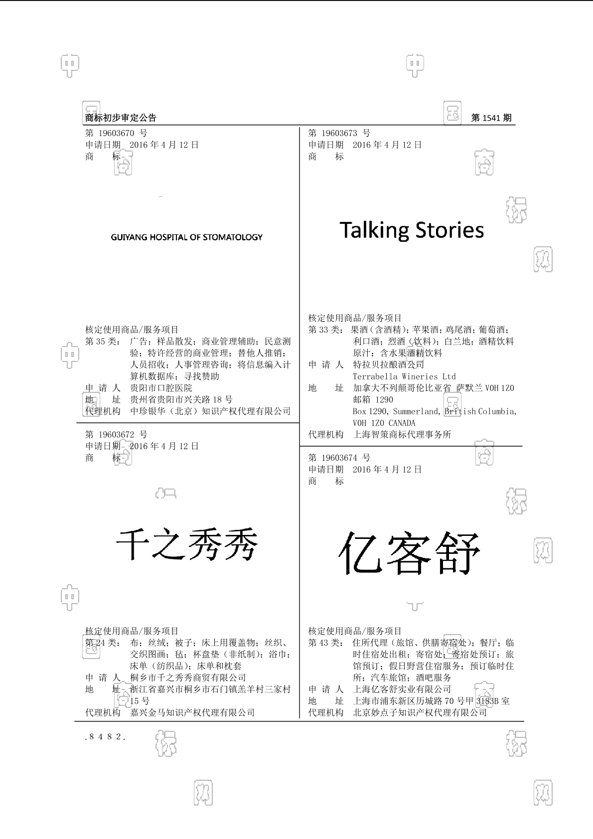 2401-丝绒;2401-布;2403-丝织、交织图画;2404-毡;2405-浴巾;2406-床上用覆盖物;2406-床单和枕套;2406-床单(纺织品);2406-被子;2407-杯盘垫(非纸制) - 1541
