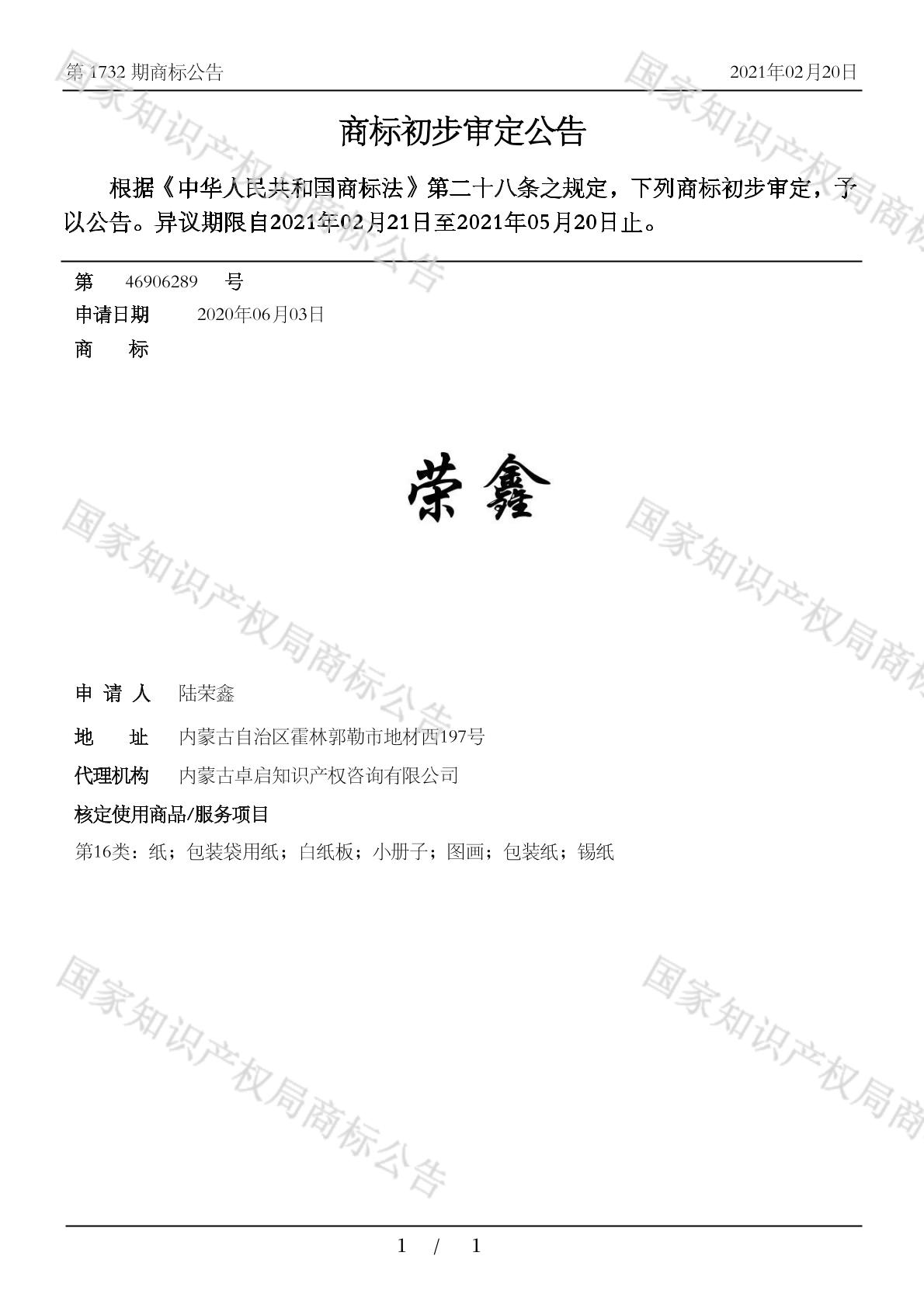 1601-包装袋用纸;1601-纸;1603-卫生纸;1603-纸手帕;1603-餐巾纸;1604-白纸板;1605-小册子;1607-图画;1609-包装纸;1609-锡纸 - 1732