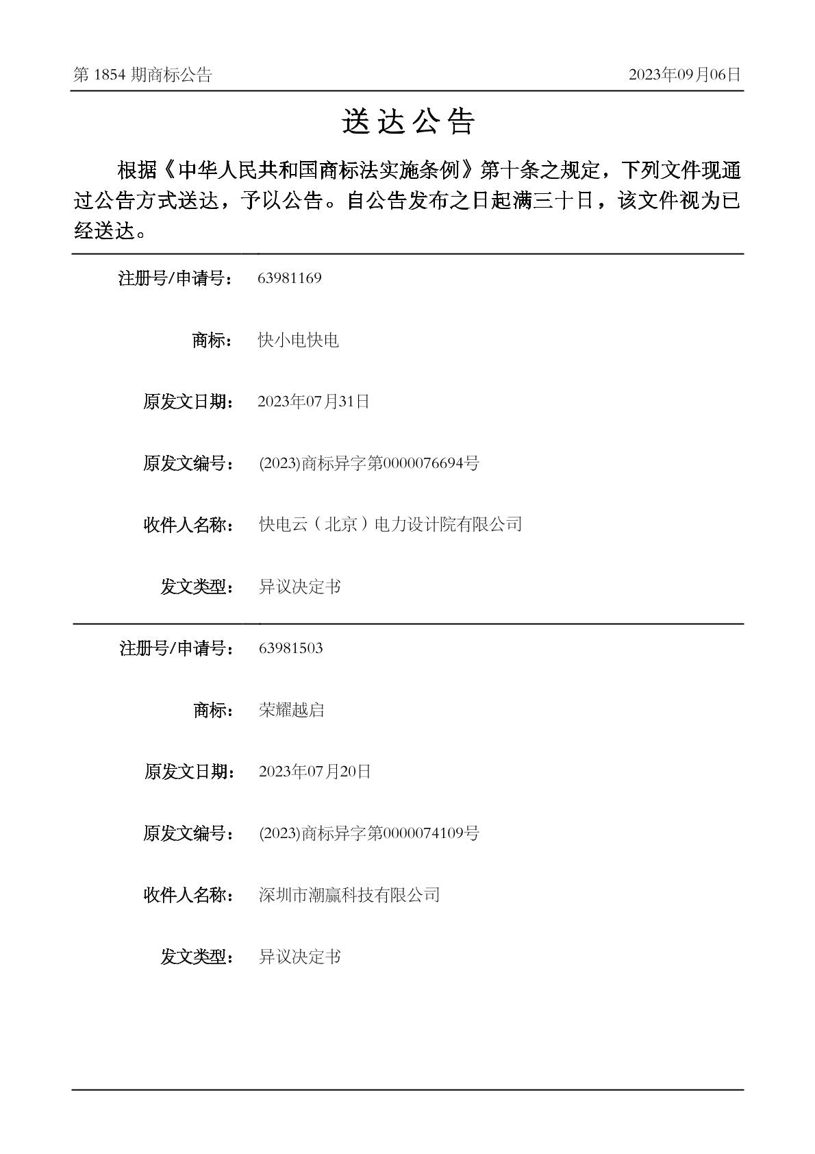 2023-08-16 商标异议申请 | 裁定书发文