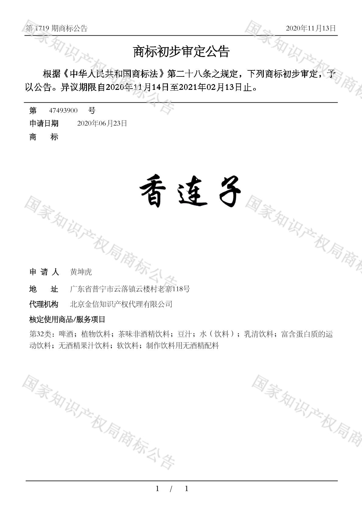 3201-啤酒;3202-乳清饮料;3202-富含蛋白质的运动饮料;3202-无酒精果汁饮料;3202-植物饮料;3202-水(饮料);3202-茶味非酒精饮料;3202-豆汁;3202-软饮料;3203-制作饮料用无酒精配料 - 1719