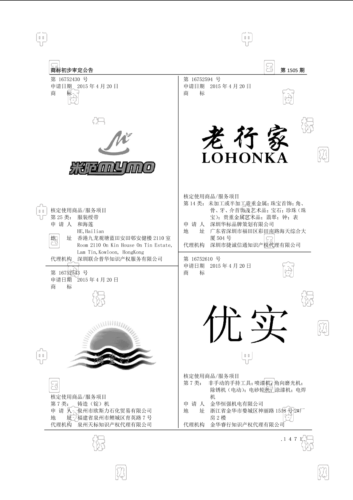 1401-未加工或半加工贵重金属;1402-首饰盒;1403-宝石;1403-珍珠(珠宝);1403-珠宝首饰;1403-翡翠;1403-角、骨、牙、介首饰及艺术品;1403-贵重金属艺术品;1404-表;1404-钟 - 1505