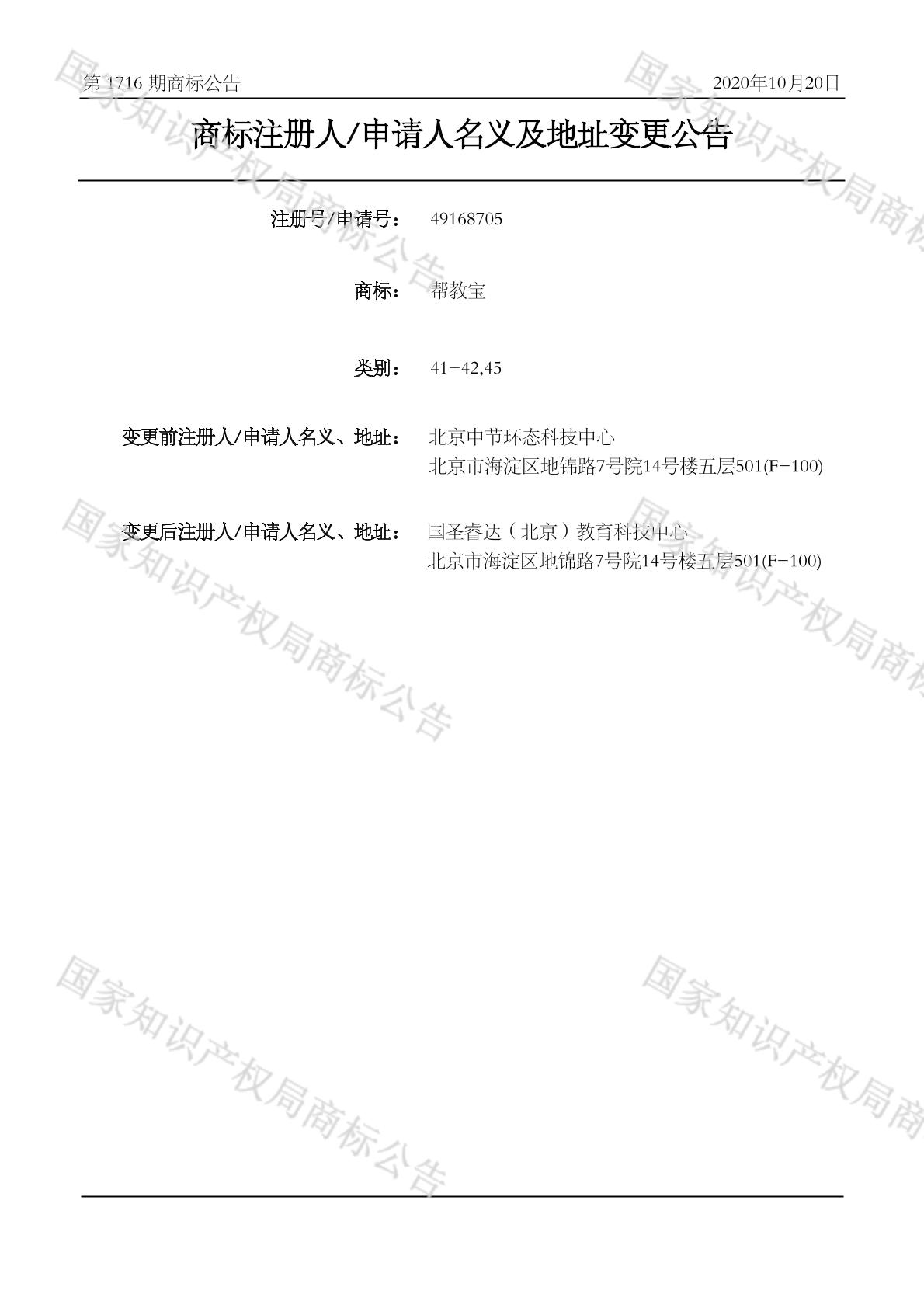 商标注册人/申请人名义及地址变更公告 2020-10-20 第1716期 查看公告